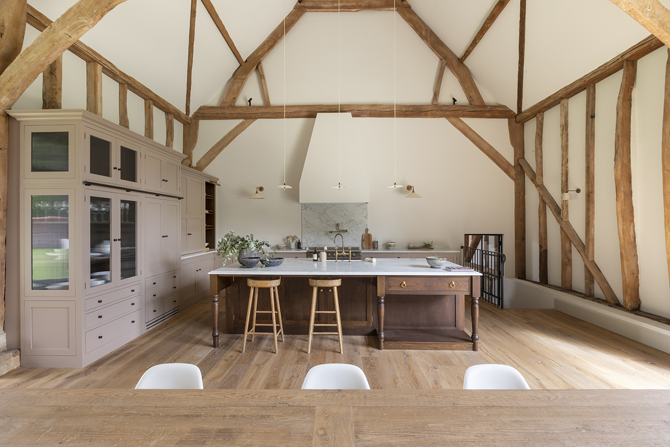 Clever kitchen joinery in an 1880s barn conversion in rural Buckinghamshire brings heritage character to a modern space. A three-metre island designed to read as a freestanding antique showcases traditional details including turned legs, brass hardware and a rounded worktop edge. ‘Dark-stained oak introduces a richness…echoing the warmth of the original oak beams,’ says Tori Young, creative lead at interior design practice HollandGreen. In sharp but effective contrast with the more modern surrounding cabinetry, the central island is a nod to the building’s history. It works, says Young, because joinery ‘should feel as though it has always belonged’.
