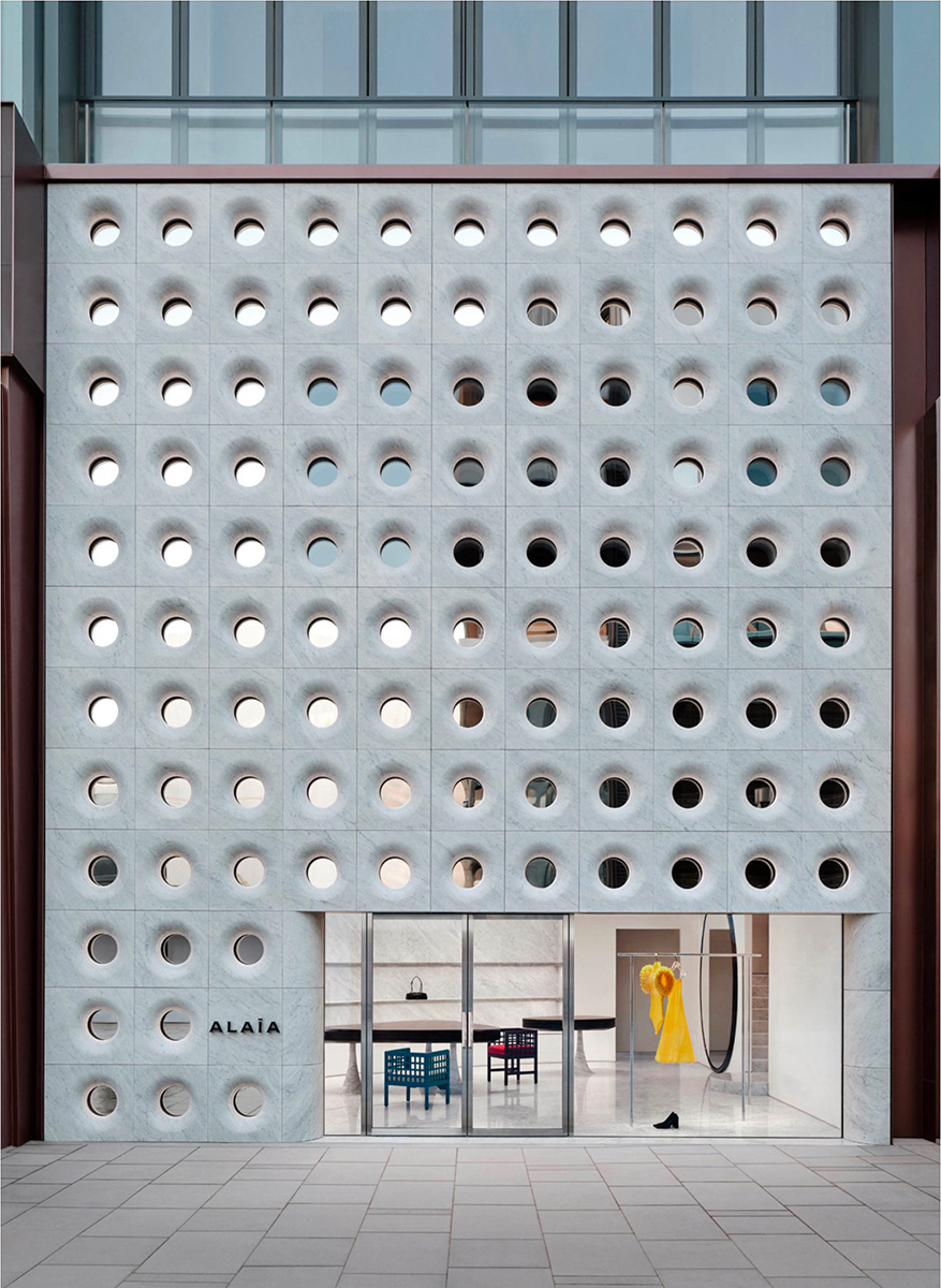 White marble was used liberally at Alaïa’s first brick-and-mortar outpost in Beijing, at the hand of creative director Pieter Mulier and Stockholm architecture practice Halleröd. Vast blocks of it coat the façade of the maison’s double-height retail space at Taikoo Li Sanlitun, the city’s high-end shopping Mecca. Interiors pay homage to Alaïa’s structural style with geometric seating and tables designed by Paul Poiret and by Philippe Malouin, all the while softened by a layout of flowing curves.