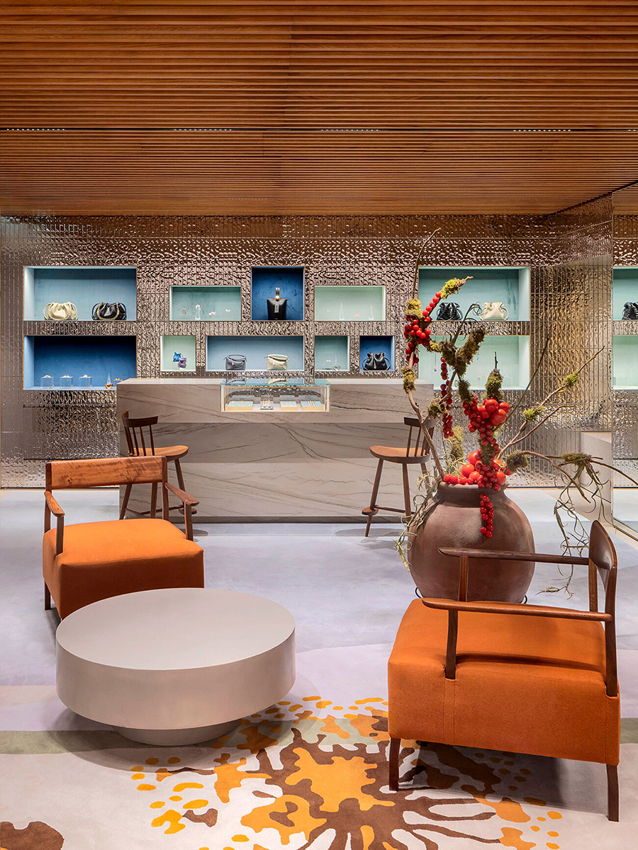 Loewe’s latest opening in Austria celebrates the brand’s playful spirit and reverence for craftsmanship. Set in the central shopping hub Kohlmarkt, the store welcomes customers with a feast of textures and colours. A backdrop of marble, oak, brass and handmade multicoloured ceramics set off the brand’s signature designs, including a table made from recycled leather, a bench in quilted leather and wool rugs custom-made in Spain. The furniture selection activates the space. There are George Nakashima chairs and Isamu Noguchi lamps to complement the angular lines of Gerrit Rietveld’s Utrecht chairs. Abstract landscapes by British textile artist John Allen lend the space a gallery-like feel.