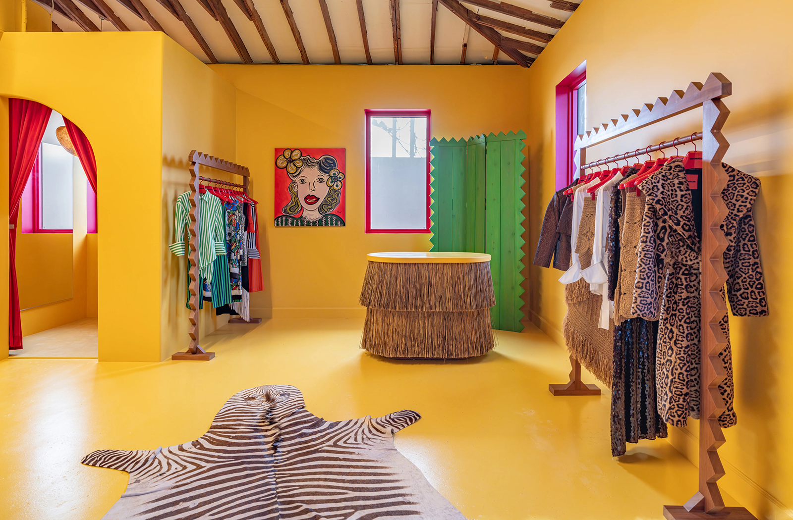 Unapologetically colourful, Simon Miller’s new 1,000sqft flagship is at home in Little River, the city’s up-and-coming hub for art and design. Chelsea Hansford, creative director of the LA brand, tapped her set-designer husband Darel Granoth of Dee Gee Design to craft the interiors, which embody the brand’s penchant for pigment and geometry — splashes of yellow, blue and punchy green take over the two casitas, complemented by tropical greenery. Together they celebrate 1970s energy and Mexican ambience with custom Memphis-inspired furniture and artworks by Leonard Urso and Peter Keill.