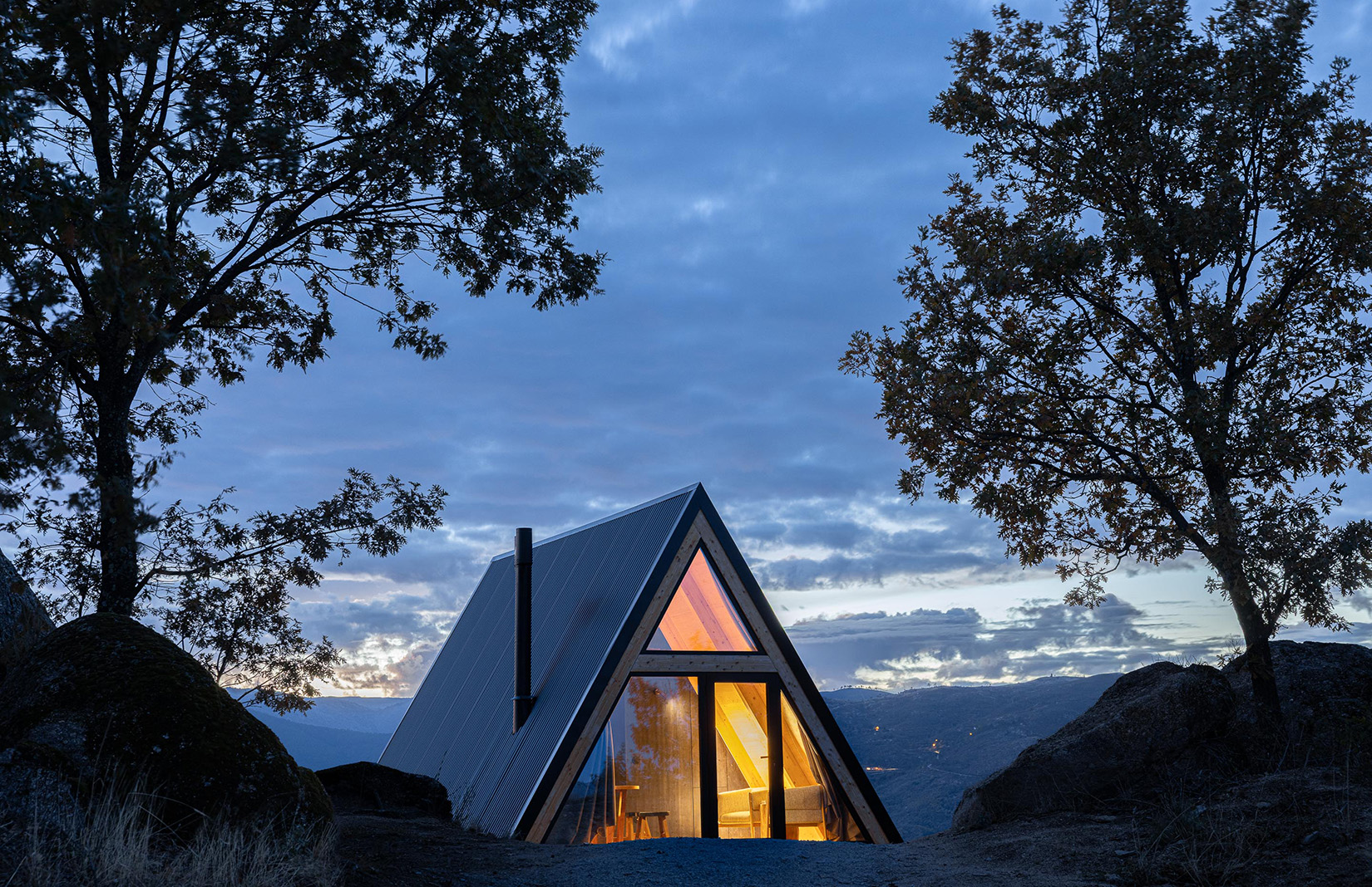 Just in time for duvet season, a new series of A-frame cabins has opened on the grounds of The Vagar, a mountaintop hideaway outside the 16th-century town of Belmonte, in central Portugal. The Abrigos de Montanha, or ‘mountain shelters’, were designed by nearby practice Filipe Pina Arquitectura in the image of traditional shepherds’ shelters, or choças. They were built in three untamed locations across the property’s 250 hectares, oriented toward the lush Cova da Beira valley with views over the Serra da Estrela, continental Portugal’s highest mountain.
