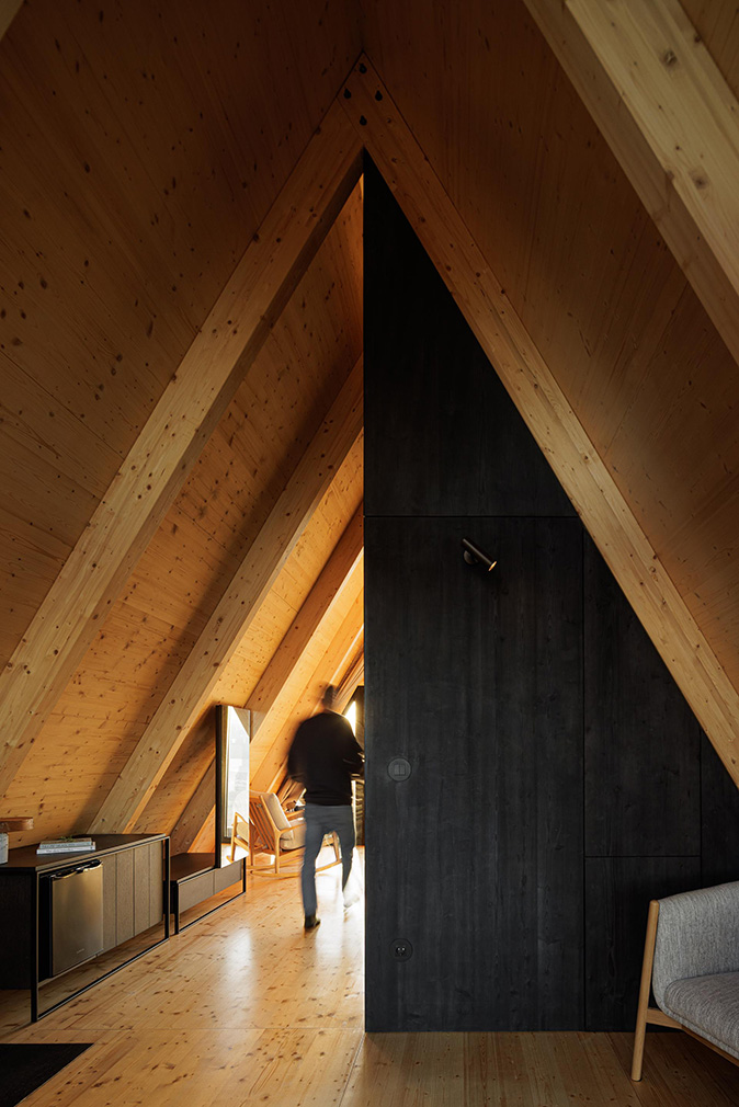 Pina’s triangular prisms are simple and clean-lined, with a bathroom and storage volume placed discreetly between the living and sleeping areas. He worked with durable, sustainable woods known to age gracefully, and designed in a compact, modular format that he says can be replicated anywhere — with or without the terrace hot tub. With their pointed profiles faced in glass, the cabins both mirror and frame the natural context while immersing visitors in the wild landscape. Flooded with light in the day and open to starry skies at night, they can function as work retreats or holiday suites free from digital distractions.