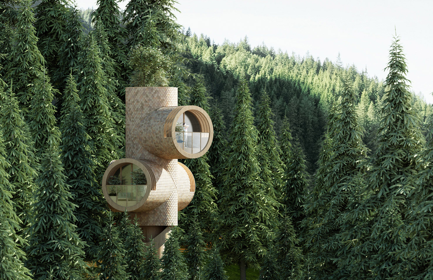 Austrian practice Studio Precht created the cylindrical home, which has huge circular windows and viewing platforms that let guests stand amidst the treeline.