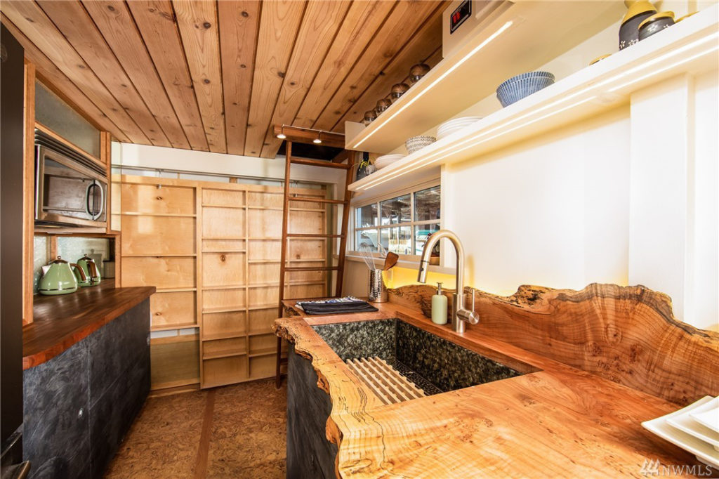 Brighton Sunshine – moored at 1080 W Ewing Place A6 – is a two-bedroom floating ‘cottage’ that was built in 1985. Located minutes from Downtown, it is on the market via Metropolist for $375,000 and comes wrapped in 376 ft of deck. But it’s inside where things take a lofty turn.