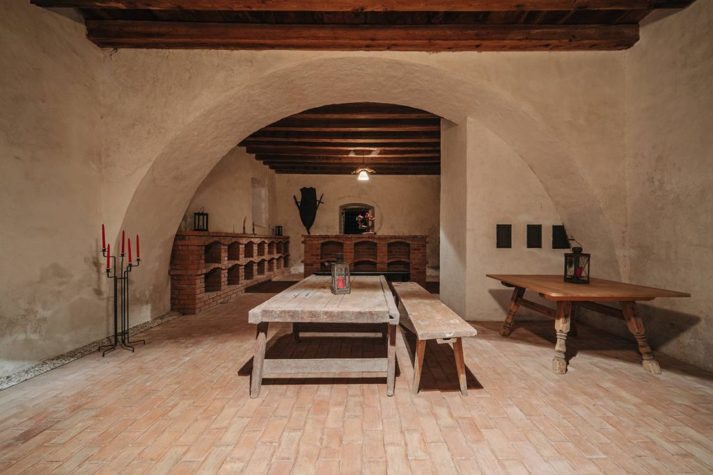 Inside, the castle preserves the integrity of its Gothic Renaissance design. Vaulted ceilings, carved timber panelling and period furnishings convey an Alpine sensibility rooted in local craftsmanship. Decorative elements survive in situ, giving each room a distinct narrative while maintaining the building’s overall coherence. Across roughly 2,070sqm of interior space, eight bedrooms and 12 bathrooms are distributed through a plan shaped by centuries of incremental change rather than modern intervention.
