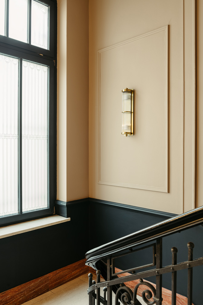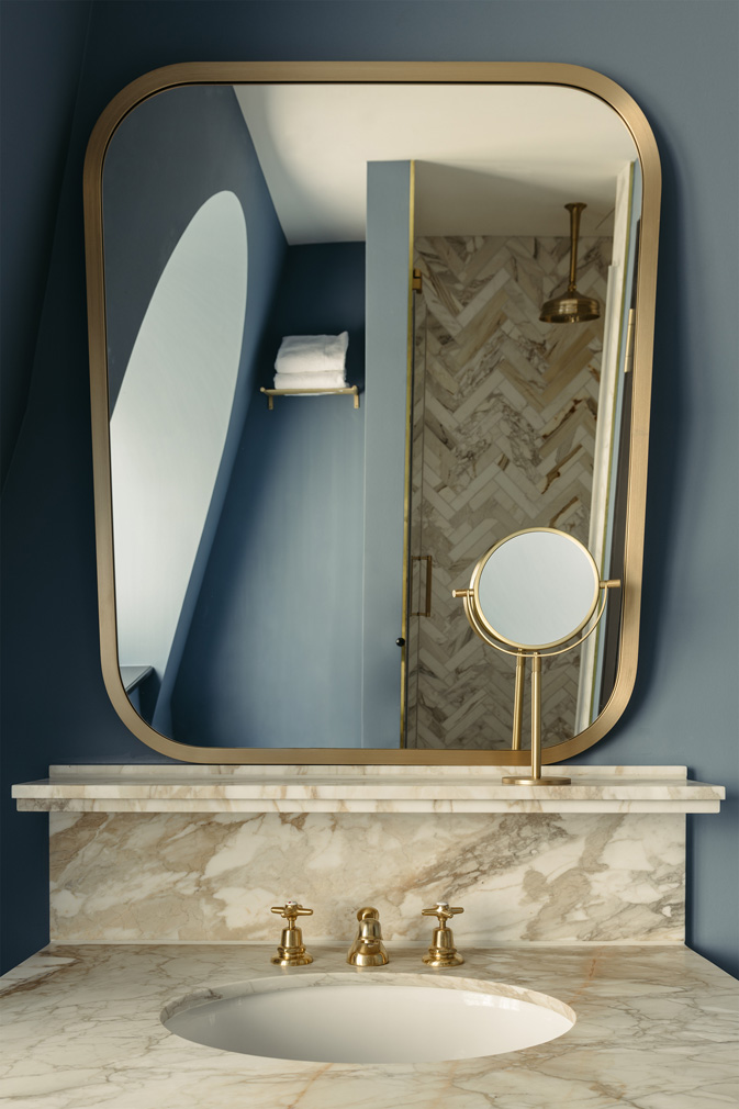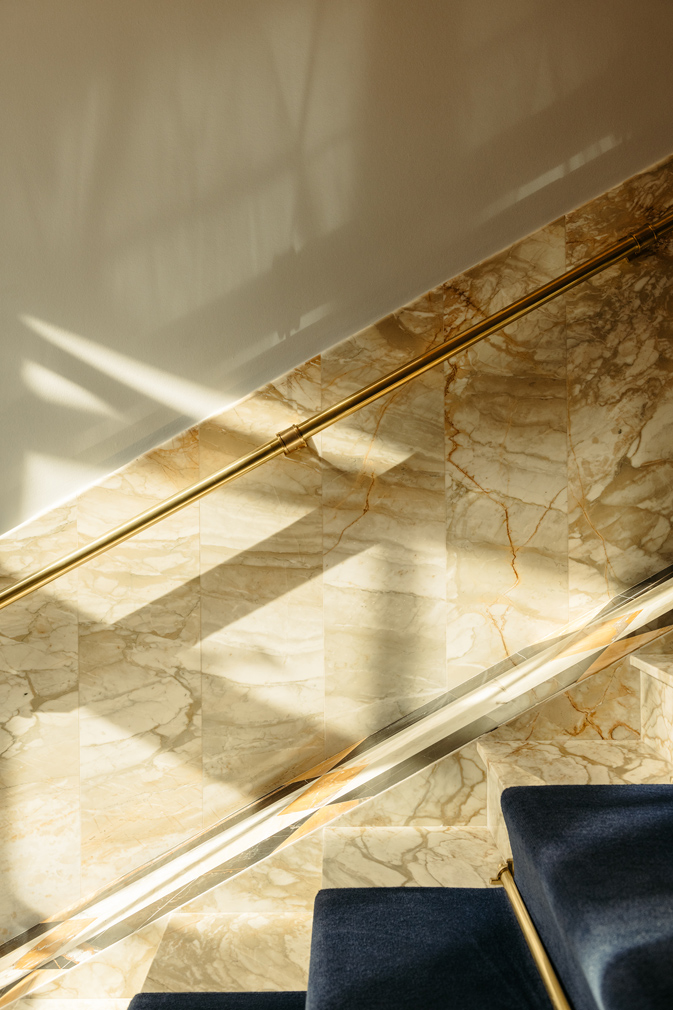 Italian architect Luigi Fragola oversaw the restoration and refurbishment of the buildings, which had previously been used as offices. Wherever possible, his studio preserved the original spaces and worked with small manufacturers to introduce premium details such as the herringbone-patterned marble tiles in the bathrooms.