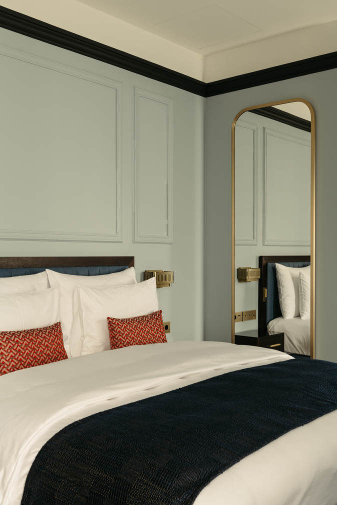 The blending of tradition and modernity continues in the ground floor restaurant, Le Petit Royal Frankfurt, where custom-upholstered furniture and midcentury glass lamps contribute to the relaxed ambience.