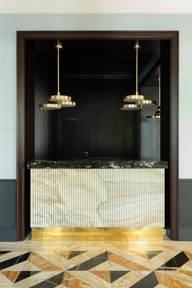 A sensual material palette of dark mahogany, brass, velvet and leather complements the formal character of the existing architecture, while fifties-inspired furniture and lighting add to the glamorous aesthetic.