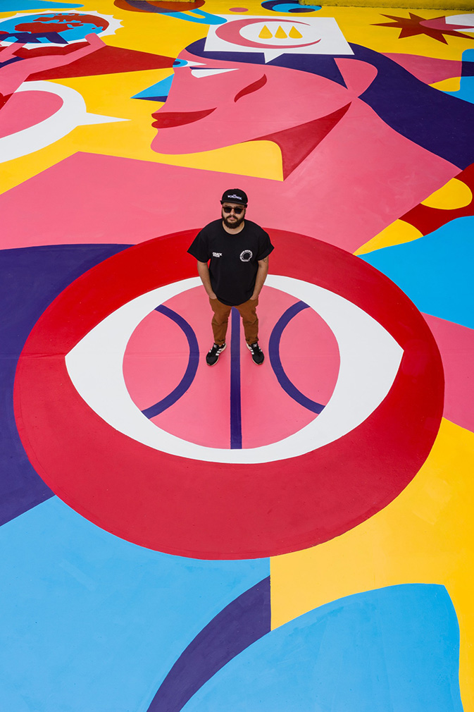 The Portuguese street artist used 91 litres of paint to cover the court in blue, pink, red and purple. He says the piece, named Balance, is about the search for ‘a perfect duality’.