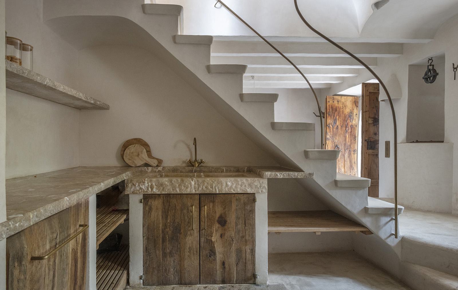 Though rooms are characterised by traditional lime and weathered wood, they’ve been modernised behind the scenes with air conditioning, underfloor heating and fibre internet wiring. The kitchen’s reclaimed wood cabinetry and rough-edged Binissalem stone countertops are balanced out by up-to-date appliances and raw-brass hardware.