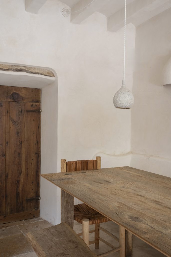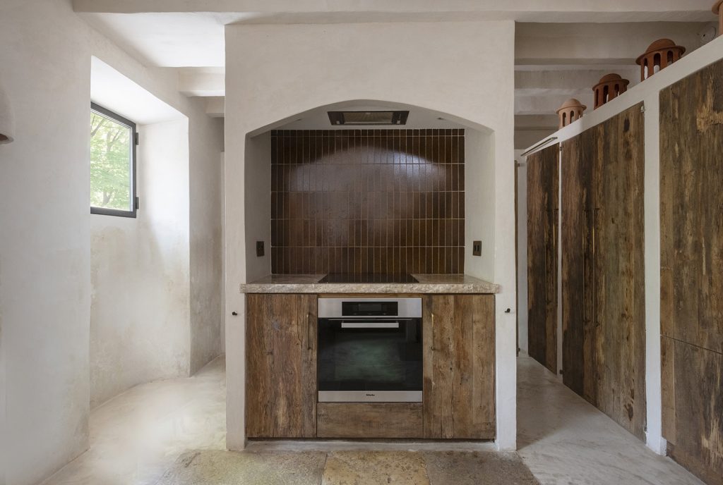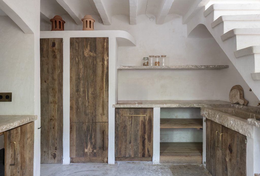 Though rooms are characterised by traditional lime and weathered wood, they’ve been modernised behind the scenes with air conditioning, underfloor heating and fibre internet wiring. The kitchen’s reclaimed wood cabinetry and rough-edged Binissalem stone countertops are balanced out by up-to-date appliances and raw-brass hardware.