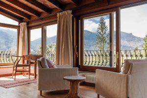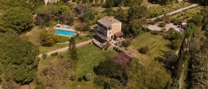 Walls are finished in lime render, with timber beams, stone floors and joinery defining the interior. At ground level, living spaces open onto shaded terraces and garden areas. A saltwater pool sits below the house, positioned against views of the surrounding mountains.