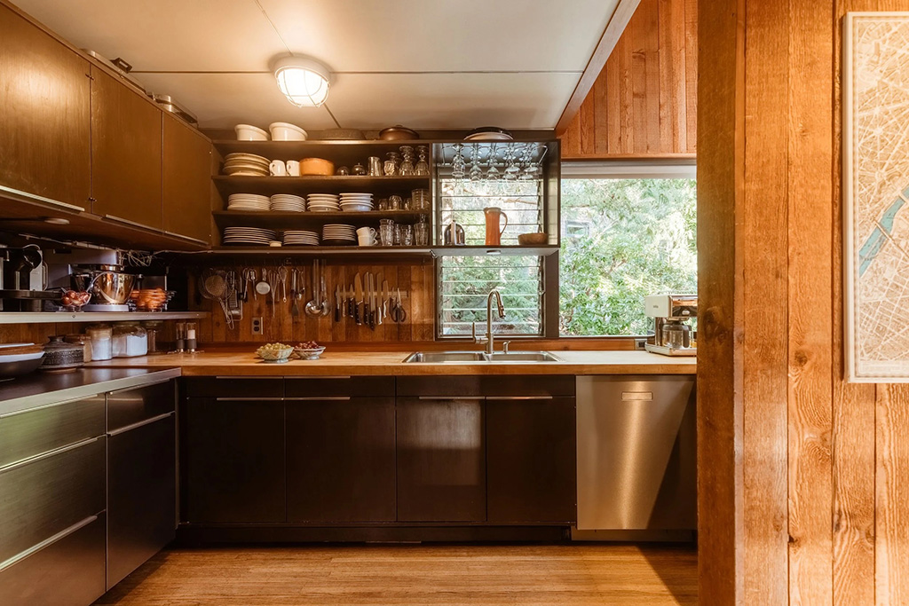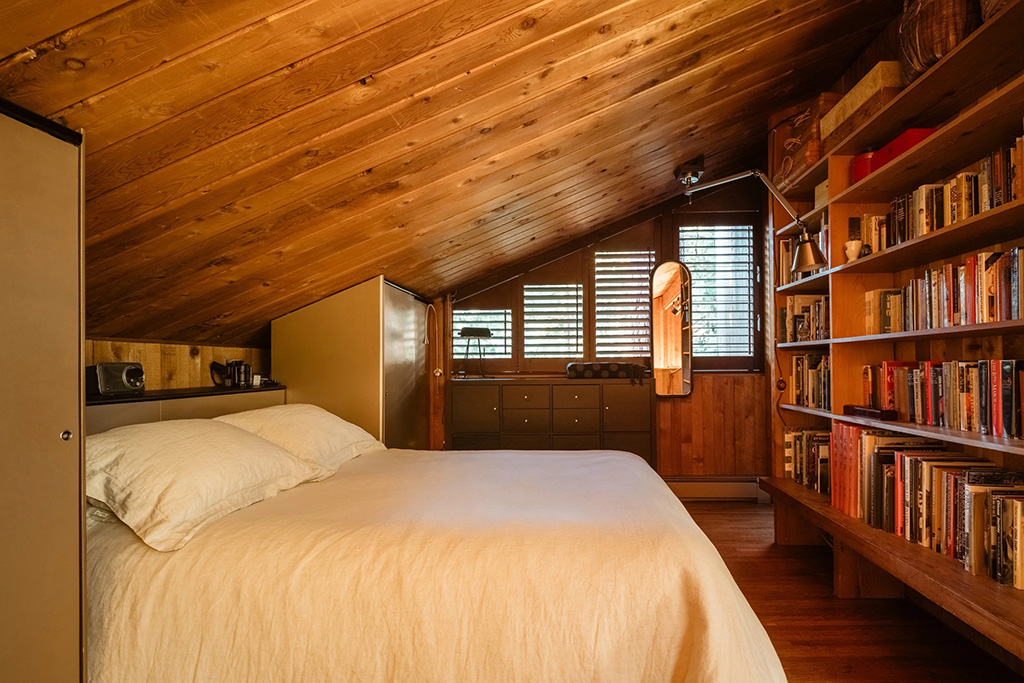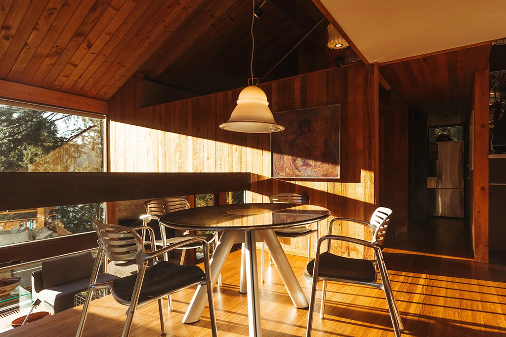 A double-height living room anchors the house, its cedar-lined surfaces illuminated by changing light across the day. Decks arranged around the exterior extend the living spaces outward toward Eagle Harbour. The property is listed for $2,175,000 through West Coast Modern.