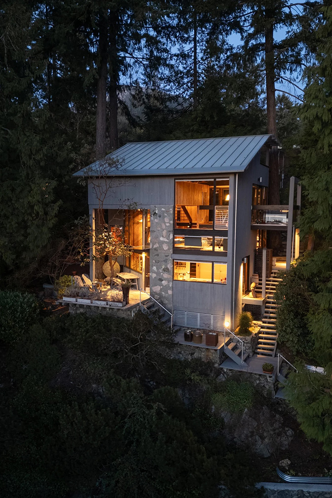 A double-height living room anchors the house, its cedar-lined surfaces illuminated by changing light across the day. Decks arranged around the exterior extend the living spaces outward toward Eagle Harbour. The property is listed for $2,175,000 through West Coast Modern.