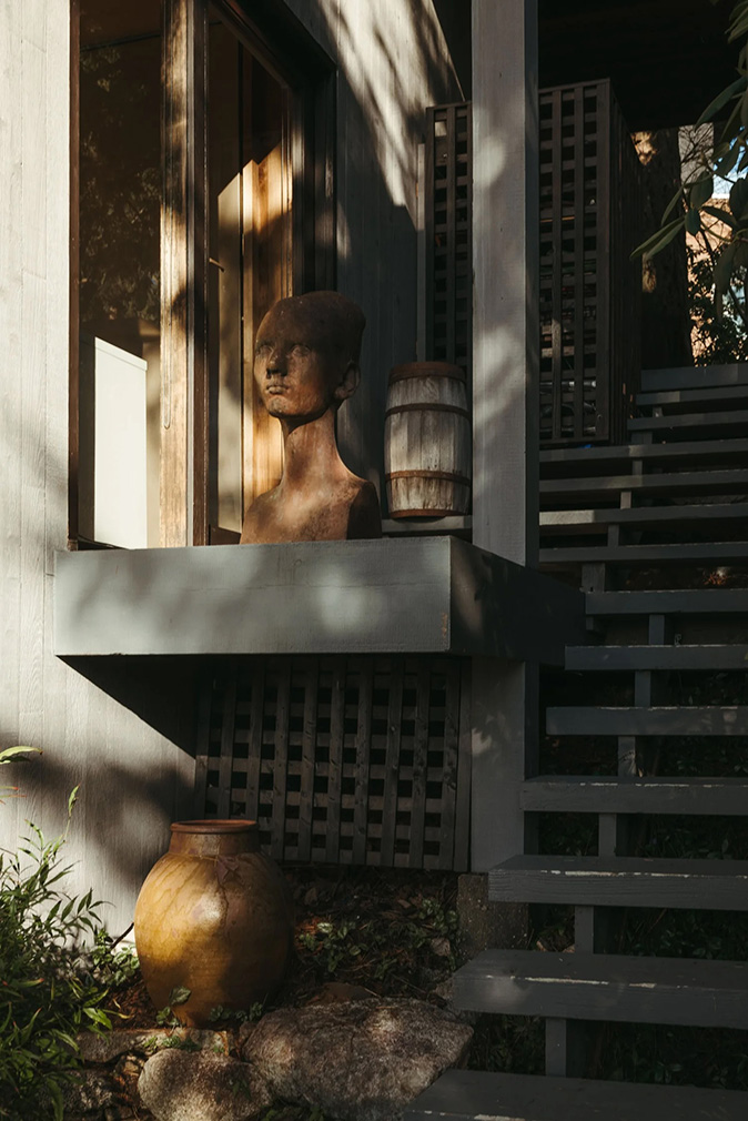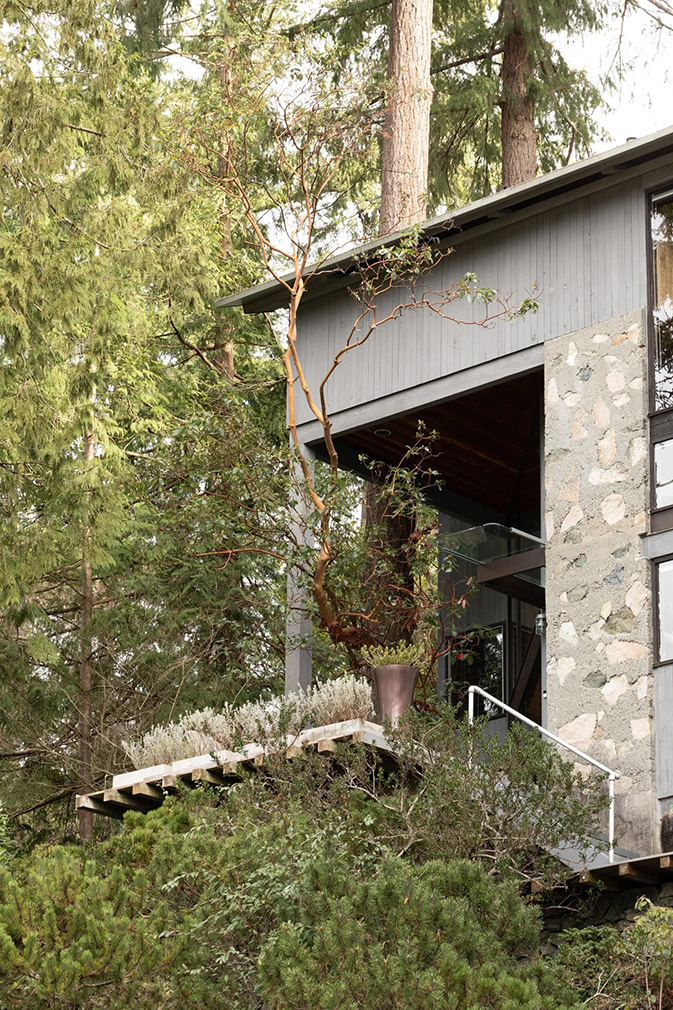 At the centre of the plan, a native arbutus tree rises through a two-level void in the structure. The gesture reflects a broader approach in which the architecture responds to the existing landscape rather than replacing it. Materials follow the regional language of West Coast Modernism. Structural beams, large-aggregate concrete and stained cedar establish a robust palette, while expansive glazing draws daylight into the interior and frames views across the surrounding canopy.