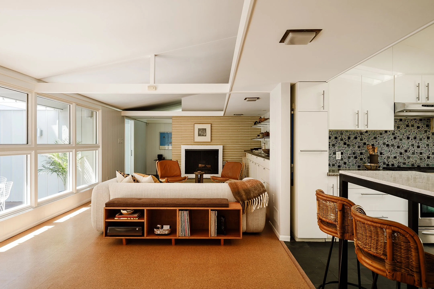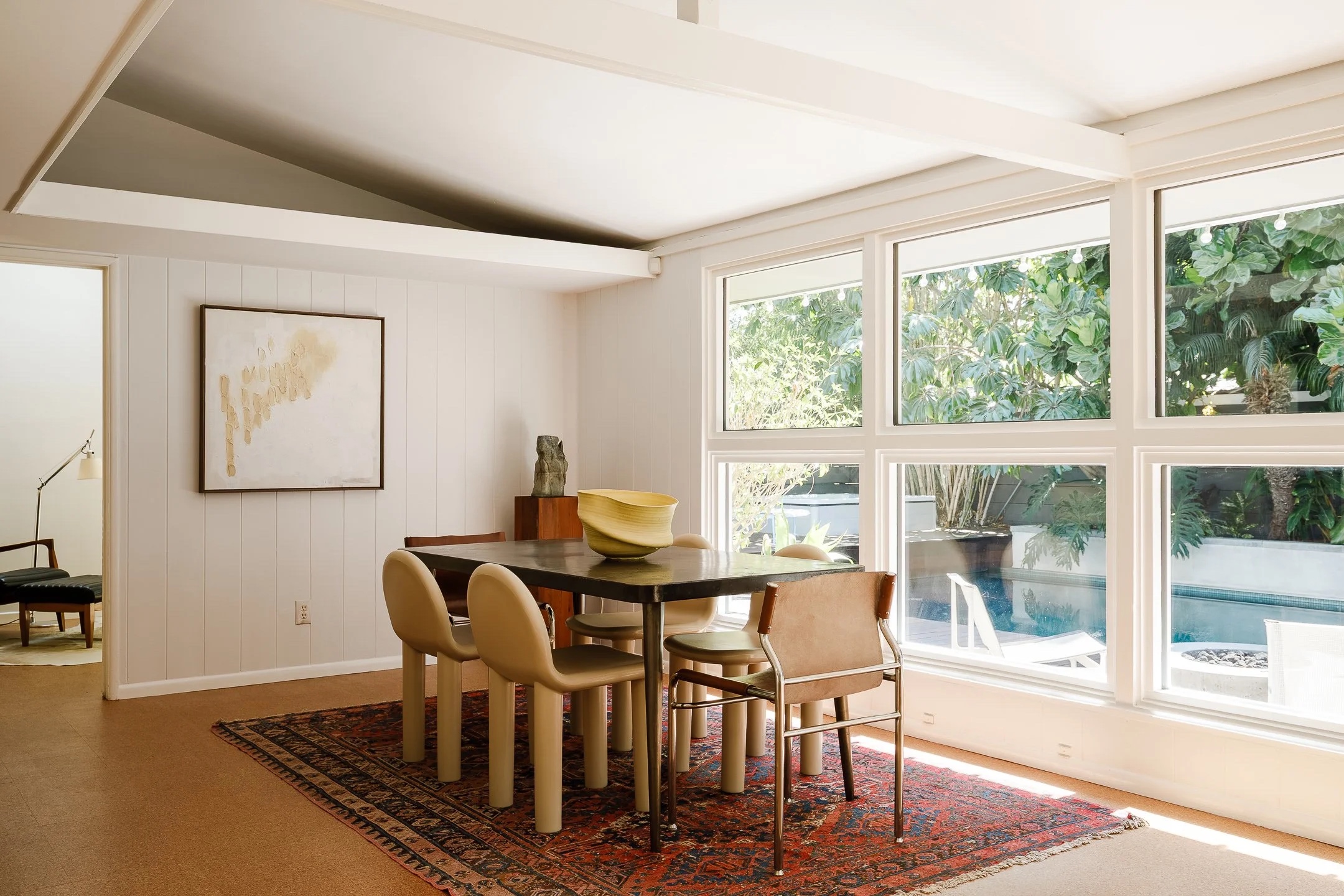 Drake House’s current owners enlisted Interstices Architecture to expand it slightly, and reconfigure the garage to allow space for a front garden and larger entrance. Their plan skilfully kept Tay’s original entryway pergola and a mature dracaena draco tree, both of which cast distinctive shadows across the home in late afternoon. The architects also harnessed space for a studio-gallery near the skylit entrance — modernist in spirit and contemporary in construction, it benefits from a retractable three-panel glass pocket door topped with a row of clerestory windows.