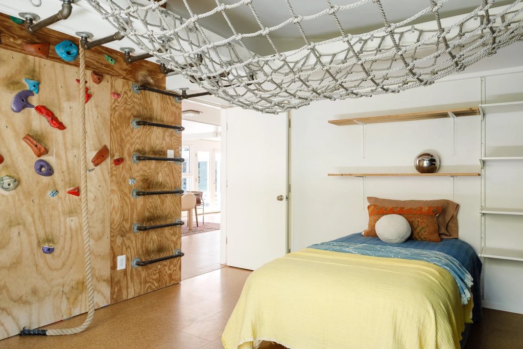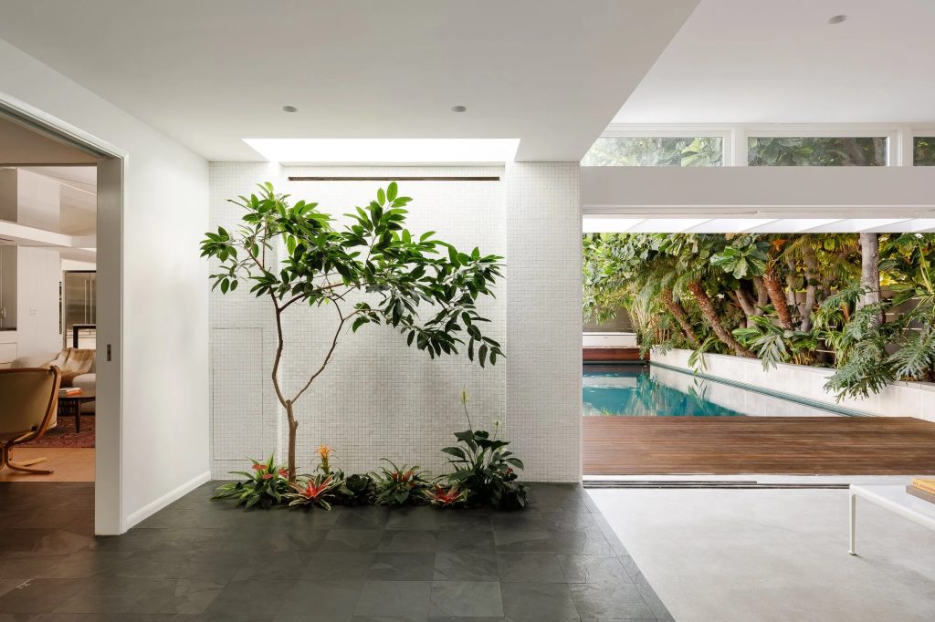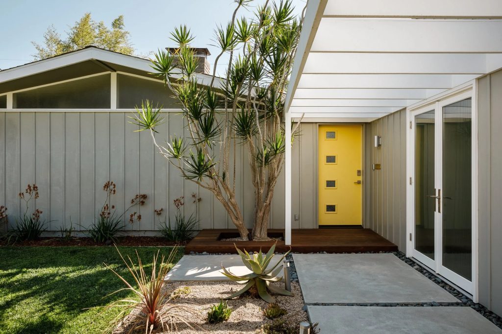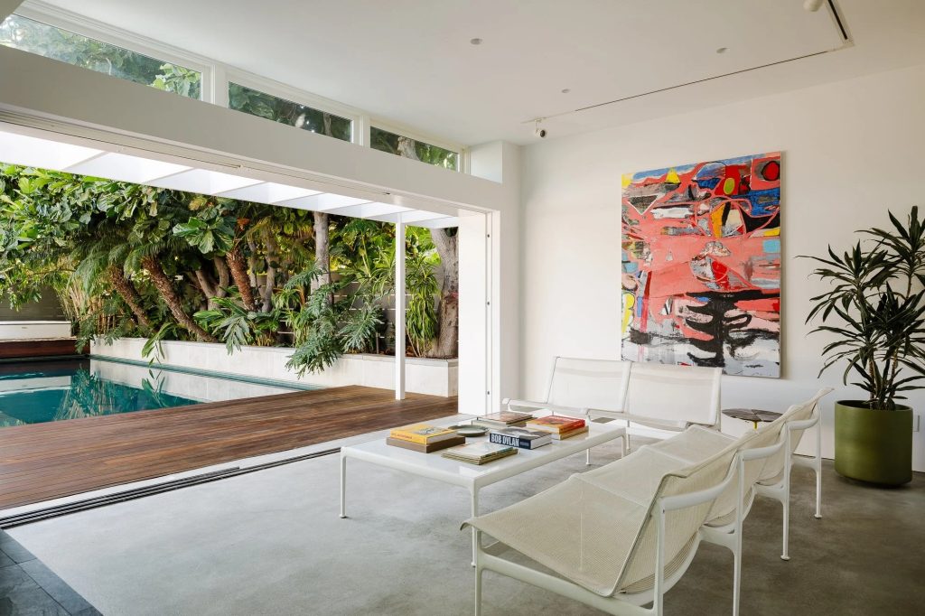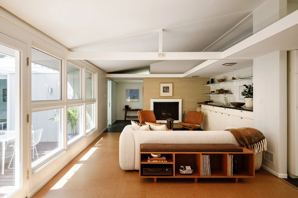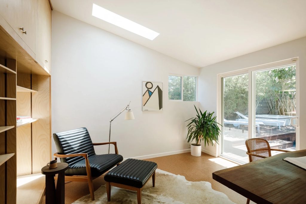 Drake House’s current owners enlisted Interstices Architecture to expand it slightly, and reconfigure the garage to allow space for a front garden and larger entrance. Their plan skilfully kept Tay’s original entryway pergola and a mature dracaena draco tree, both of which cast distinctive shadows across the home in late afternoon. The architects also harnessed space for a studio-gallery near the skylit entrance — modernist in spirit and contemporary in construction, it benefits from a retractable three-panel glass pocket door topped with a row of clerestory windows.