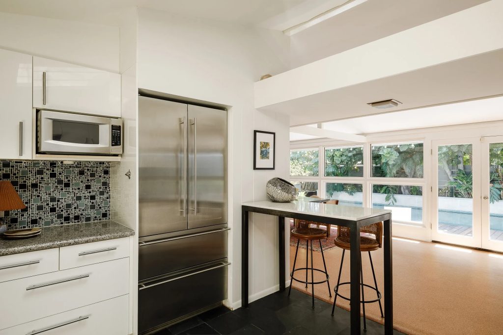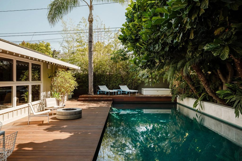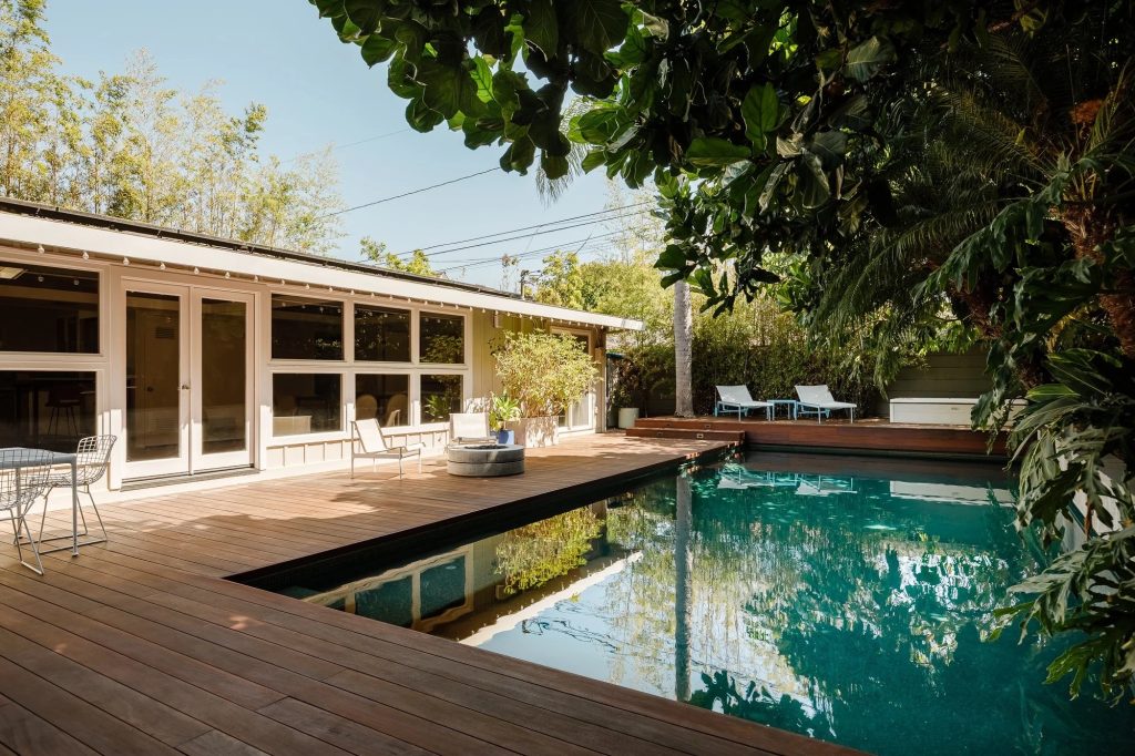 Elsewhere, Tay’s knack for nuanced colour comes through in the creative tile and brickwork. His Roman brick fireplace remains in the open-plan living room, and his zippy tiled backsplash wraps around new cabinetry in the adjacent kitchen. South-facing windows look onto the 6,500 sqft lot with its patio, pool and mature bamboo and fig trees. There are three bedrooms and three bathrooms in all.