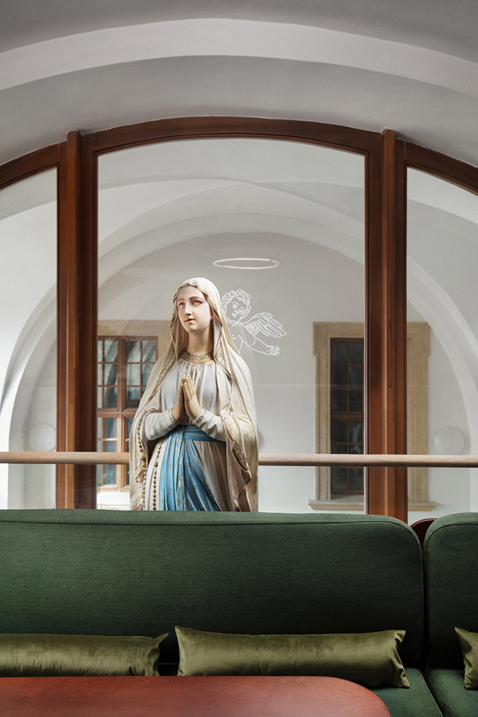 The Virgin Mary watches over the first coffees of the day at Konvict, a Czech cafe that’s borrowed some design details from the baroque chapel next door.