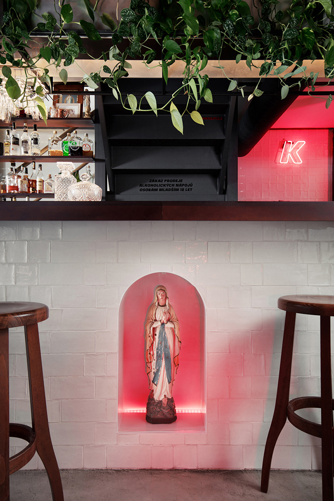 There are kitschy details such as the Virgin Mary figurine in the counter and the halo-shaped lights, as well as a vaulted ceiling that arches overhead which nods to the building’s past.