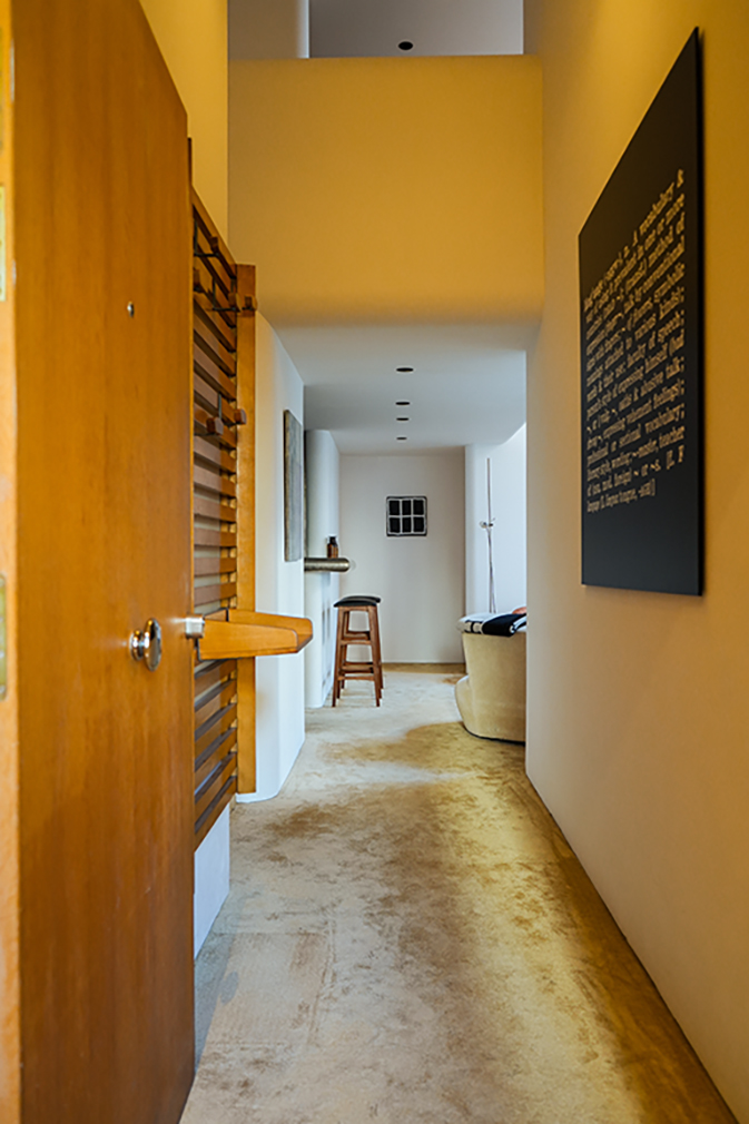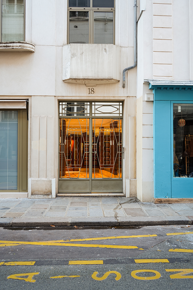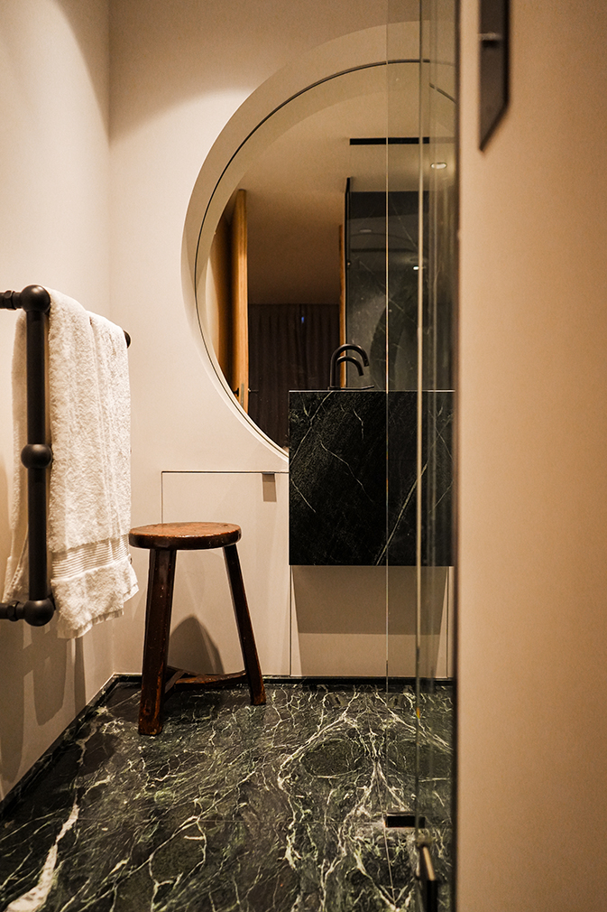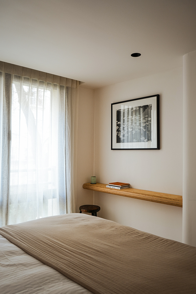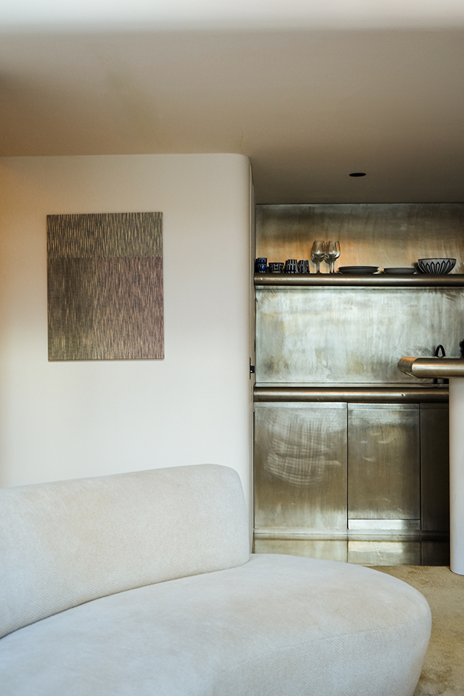 Motivated by a longtime passion for collecting heritage pieces, Dwek organised an armchair by Pierre Paulin and a coatrack by Pierre Jeanneret around a bowed armless Shorty sofa by Vladimir Kagan, overlooked by a conceptual canvas by Michel Parmentier from 1984. In one of the two bedrooms is a desk and chair by Jean Prouvé; the two bathrooms feature stools by Charlotte Perriand. And in the hallway is Nicolas Chardon’s ‘Marfa’ painting from 2023. There are 5.5m ceilings and west-facing windows overlooking a quiet courtyard.