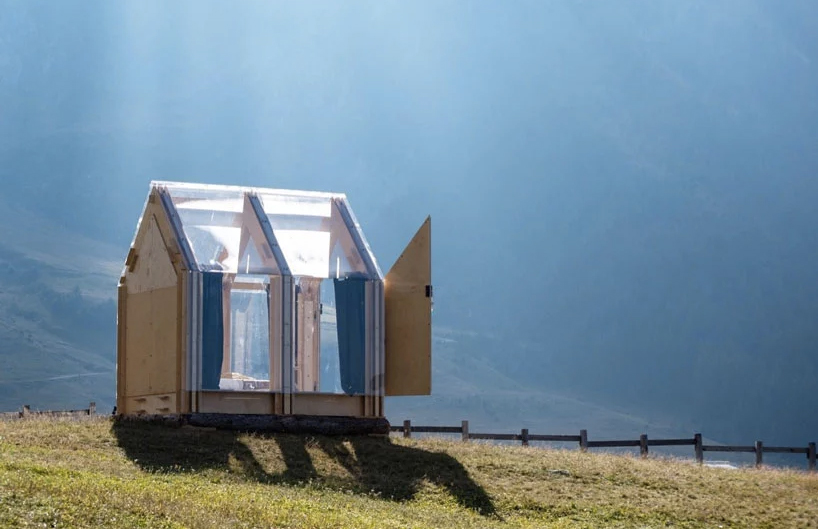 Inspired by quick-build housing designed for disaster relief, the transparent shack is erected on a hillside, surrounded by lush alpine peaks.