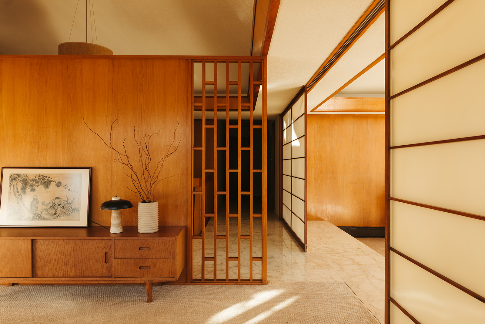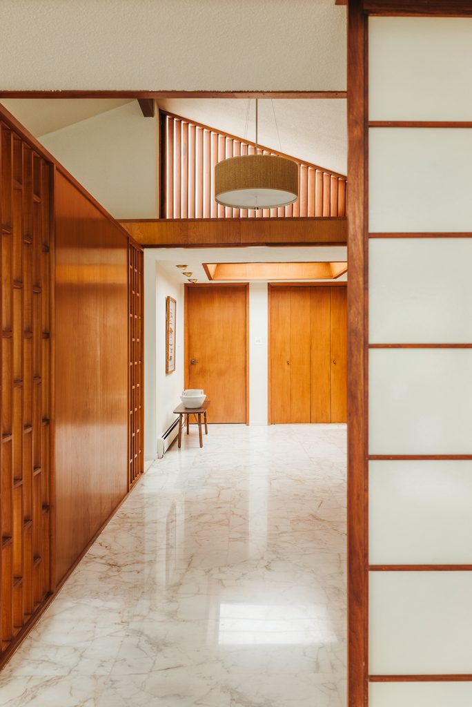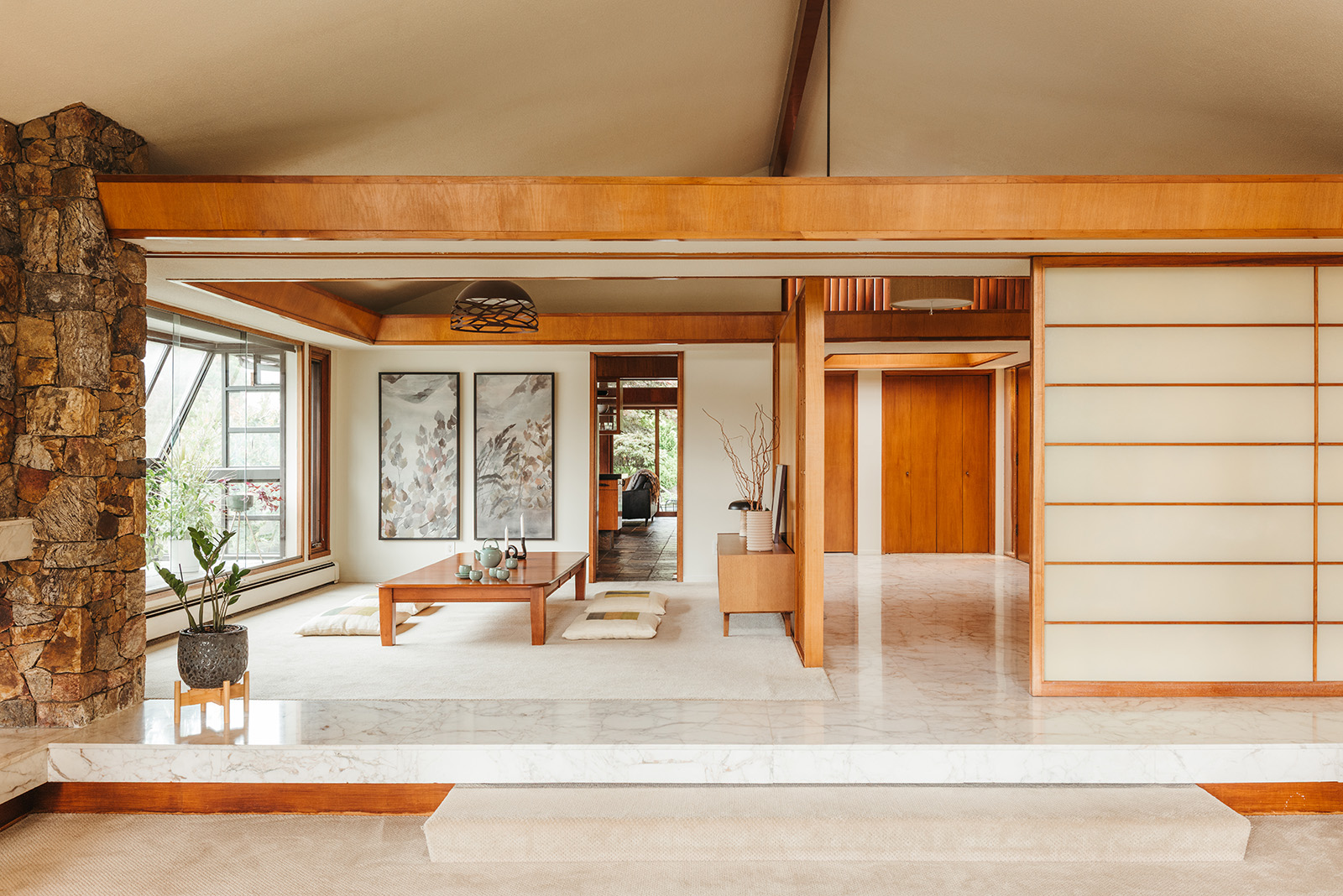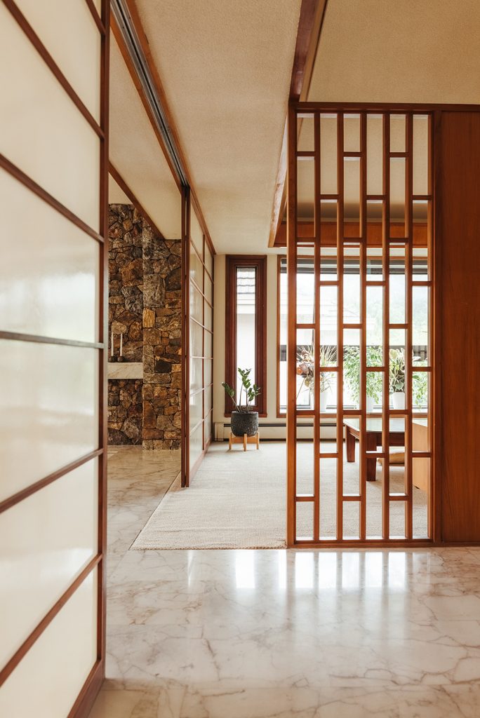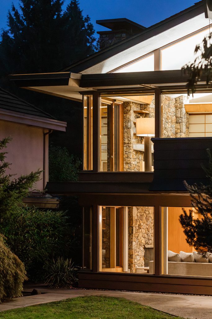 Set behind twin motor-court gates and largely hidden from view, the 5,000sqft home unfolds across low rooflines that echo the horizon. Shoji-like glazing and timber planes invite a dialogue between interior and landscape, while the upturned eaves of its carport nod to pagoda forms. Hand-set Squamish granite, mahogany doors and lily-pad paving stones express a meticulous honesty of material and form.
