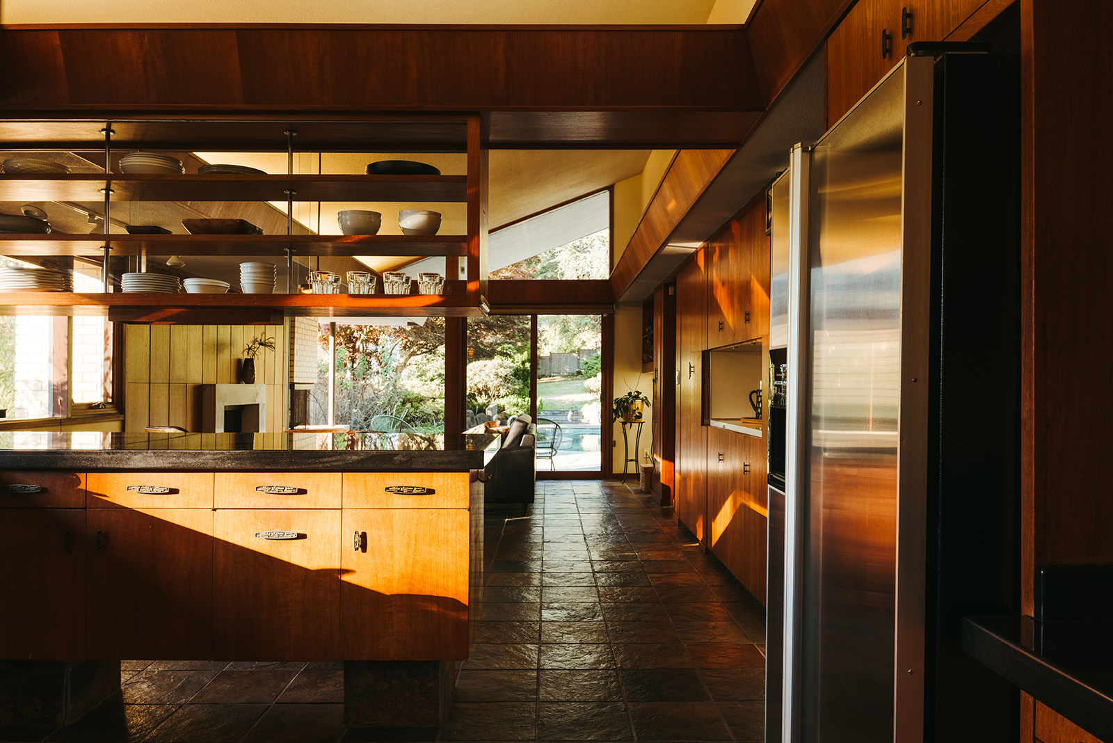 Wylie’s work channels the same spirit that shaped post-war West Coast architecture — truth to materials, reverence for site and connection to nature. At Sakura Estate, those ideas find a rare clarity. Light filters through trees and petals from the namesake cherry tree drift across the granite warmed by dusk. In a suburb now dominated by new development, the house endures as a serene study in proportion, philosophy and time.