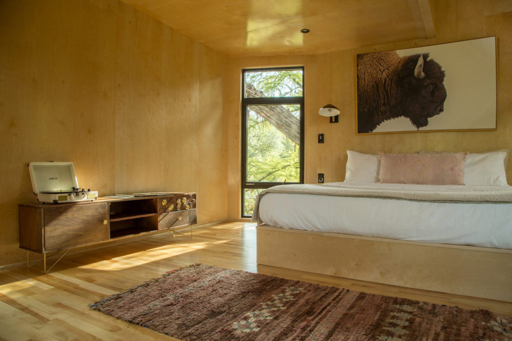 The treehouse – which is available to rent from $600 per night – was designed by ArtisTree founder Will Beilharz in Austin’s Cypress Valley. It comprises a midcentury style cabin and a separate bathhouse which is reached via a 60-ft-long bridge.