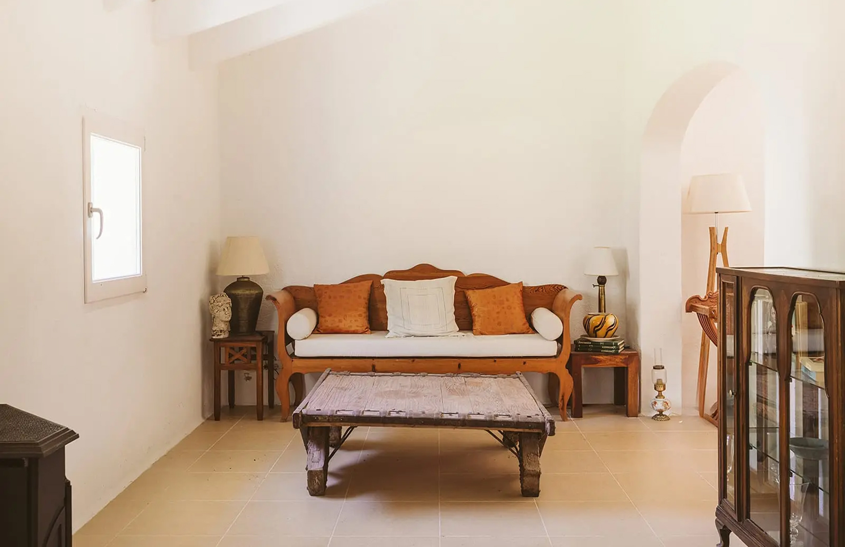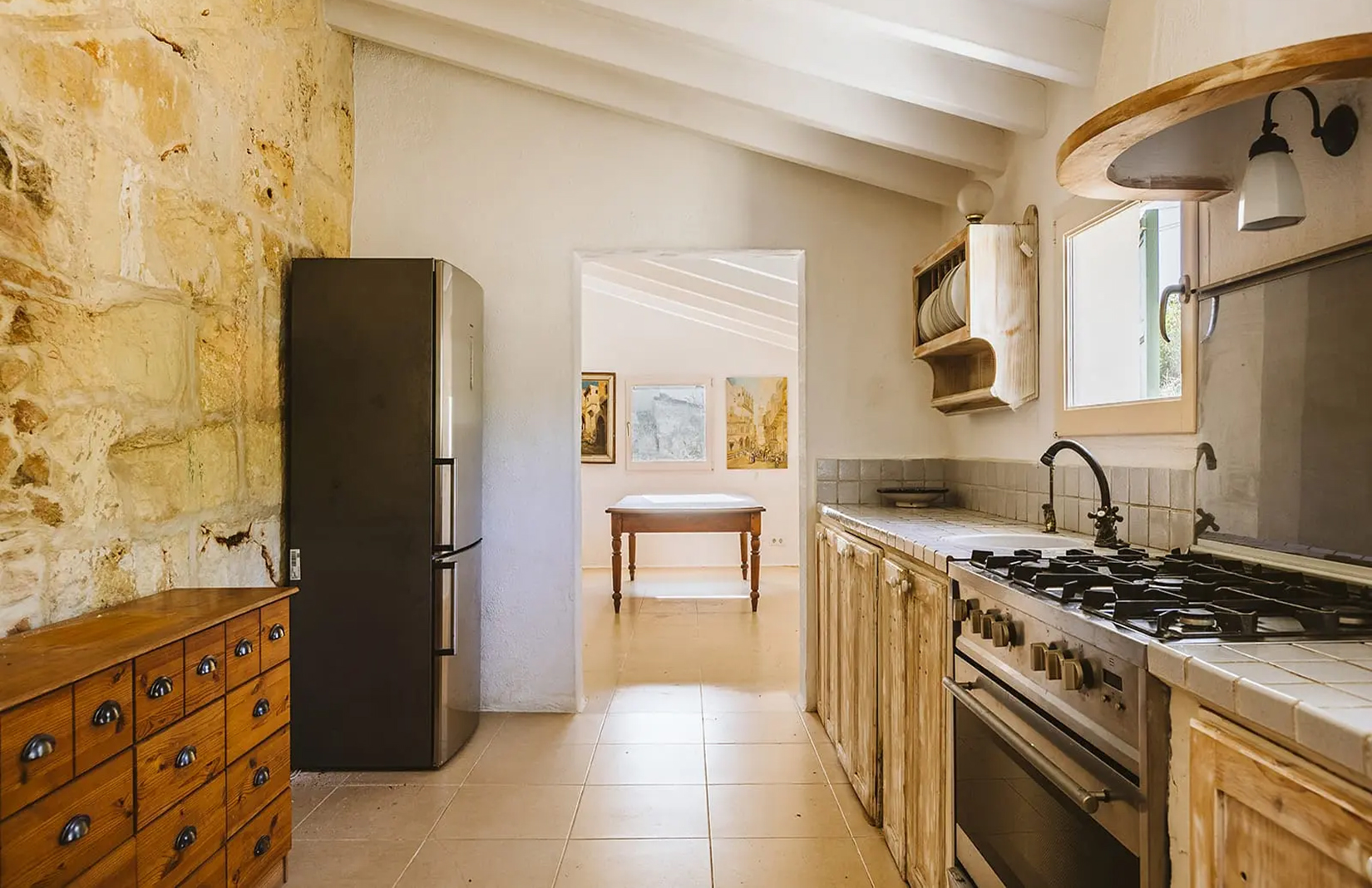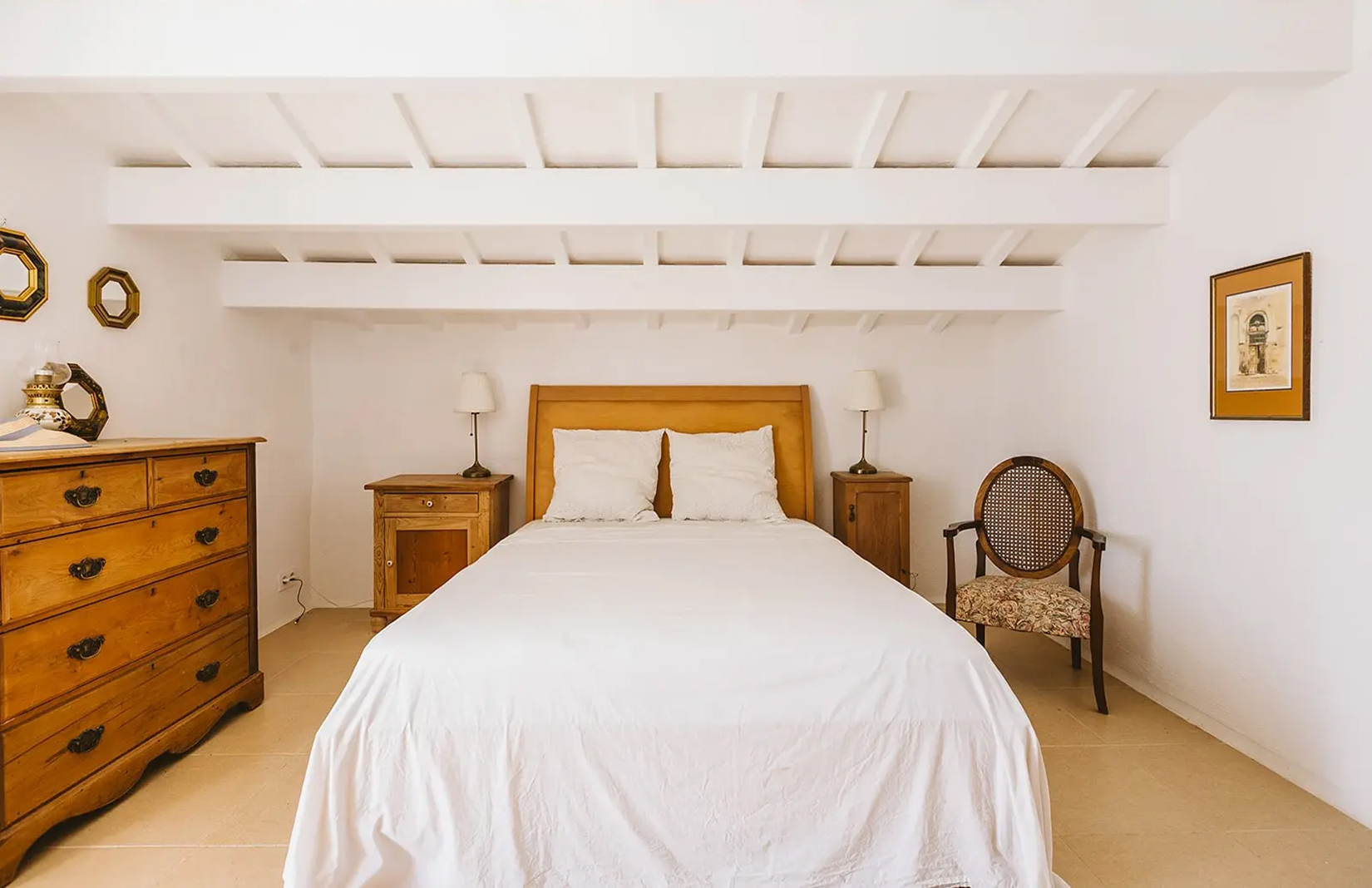 Two casitas in the mature gardens broaden the property’s potential. Each one is self-contained — with a living room, kitchen, bathroom and double bedroom — offering privacy for guests or allowing work and home life to run in parallel. Garden pathways weave through aromatic planting toward a traditional stone bread oven, a tactile detail that anchors the ensemble to Menorcan outdoor culture.