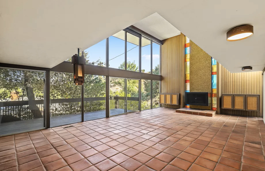 The three-bedroom post and beam property was built in 1968 for theatre Professor Omar Paxson. The Eagle Rock home in near mint condition, complete with original fireplace, custom Conrad Buff-designed fixtures, cabinetry and stained glass by Judson Studios.
