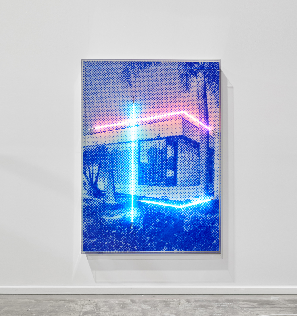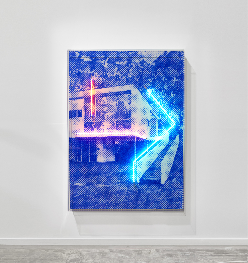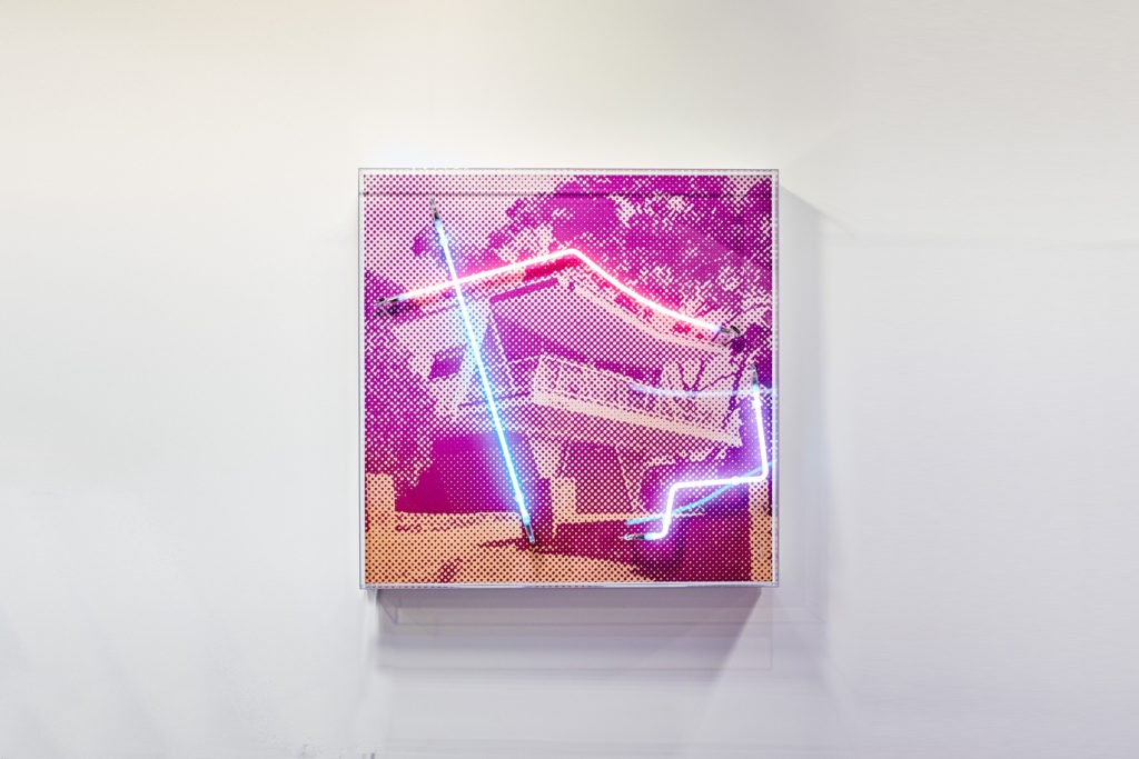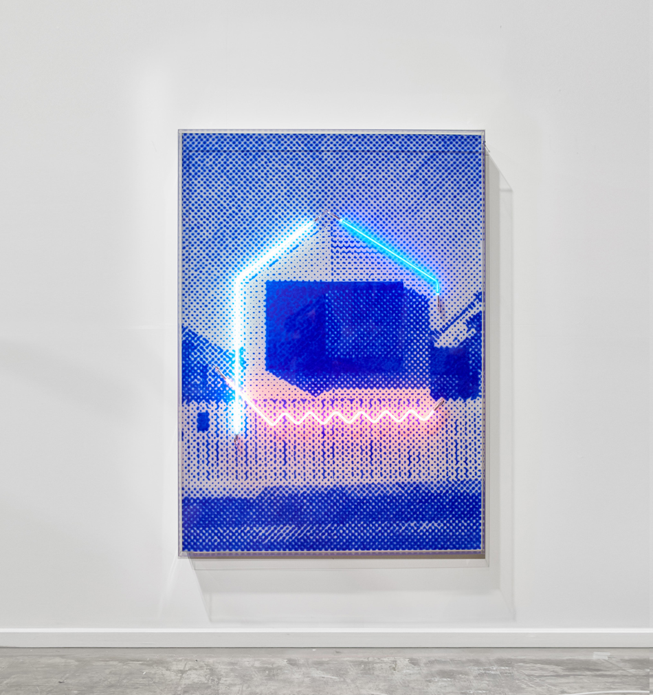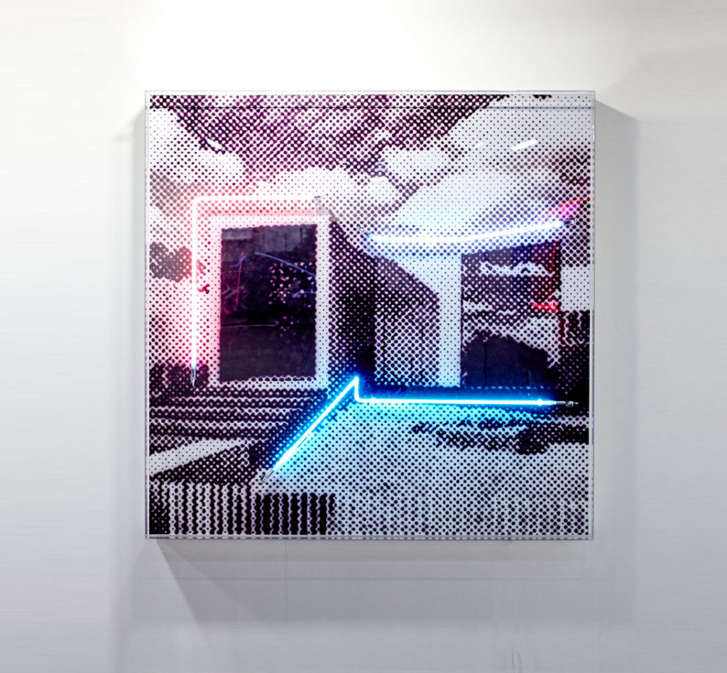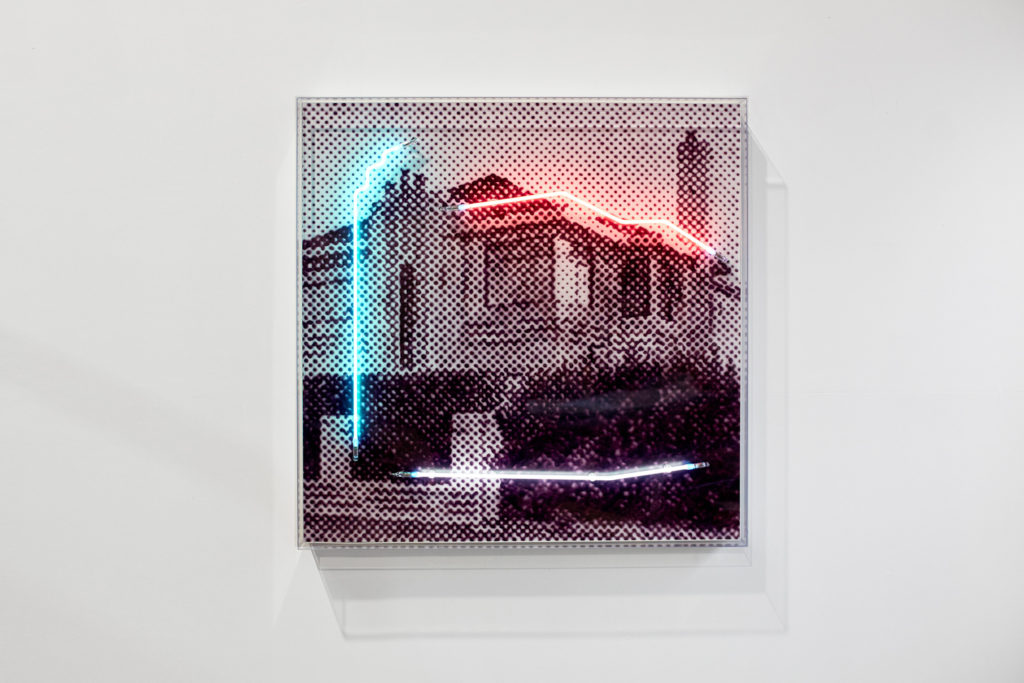 The works – on view at Metro Gallery in Victoria – combine airbrushing with graffiti and neon lighting. Melbourne-based Adair first documents the dwellings on camera before digitally translating them into monochrome halftone renderings, then adding dots and lines by hand using an airbrush.