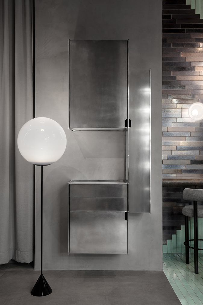 Interiors are by Tom Dixon’s Design Research Studio and feature a mint green twist on the brand’s usual industrial aesthetic. Subway tiles are offset by rugged concrete and steel finishes and marble accents, while a granite slab bar anchors the space.
