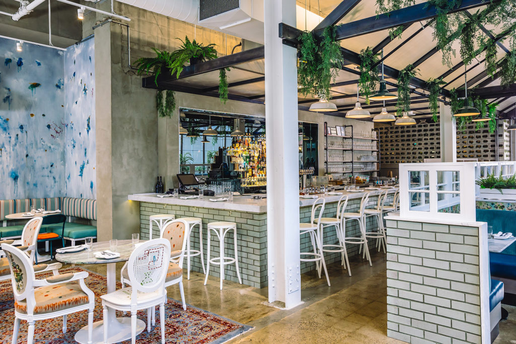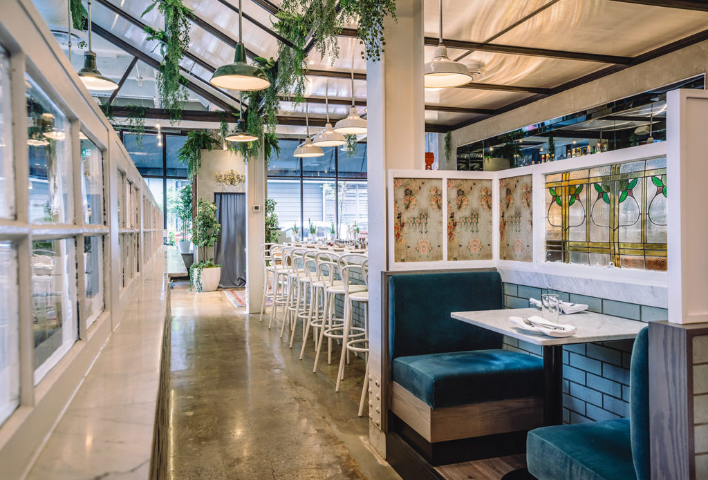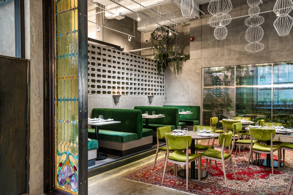 They added cement blocks, historic stained glass windows and vintage wood doors to divide the restaurant into three dining spaces. At the centre of the building is a suspended greenhouse roof, filled with hanging plants.