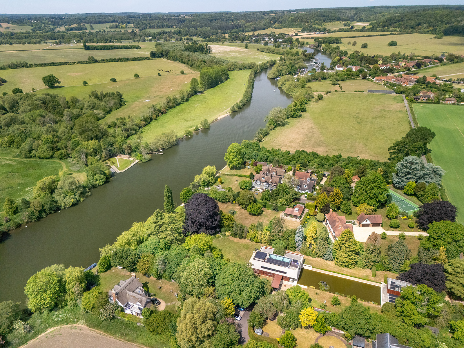 A Corten steel-clad gate house at the main entrance has space for a studio, office and garage with a one-bed guest flat above. From here, a large reflecting pool extends to the main house. And all around are mature private gardens. The lawns reach down to the river, enclosed by box and yew hedging and mature beech, willow, pine, yew, hazel, cedar and walnut trees.