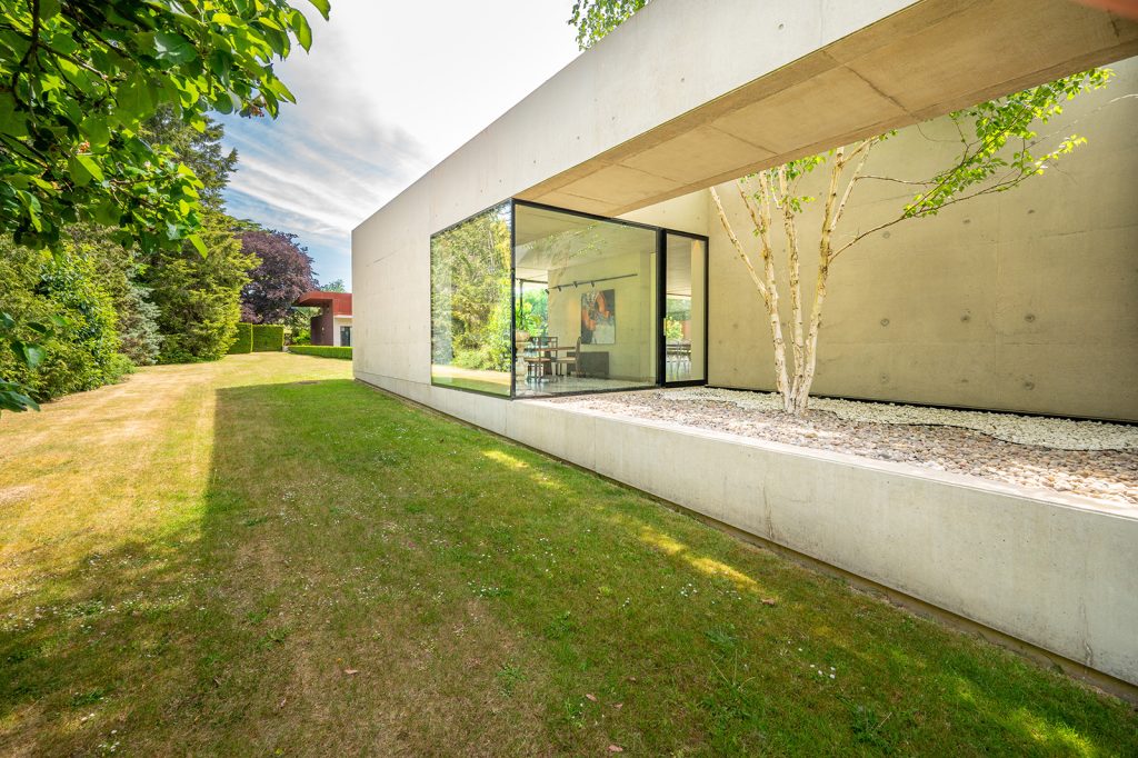 The owners commissioned a ‘country villa for the 21st century’ to replace the decaying 1950s bungalow on the two-acre site, taking inspiration from Culham Court, an 18th-century house downriver. The architects used reinforced concrete in their design, citing architectural integrity, durability, longevity and high thermal mass. Corten steel fretwork breaks up the concrete and glazing; a brise soleil at the rear of the house mitigates heat in summer yet maximises solar gain in winter. Satisfying the directive to consider sustainability are 44 solar panels along the flat roof.