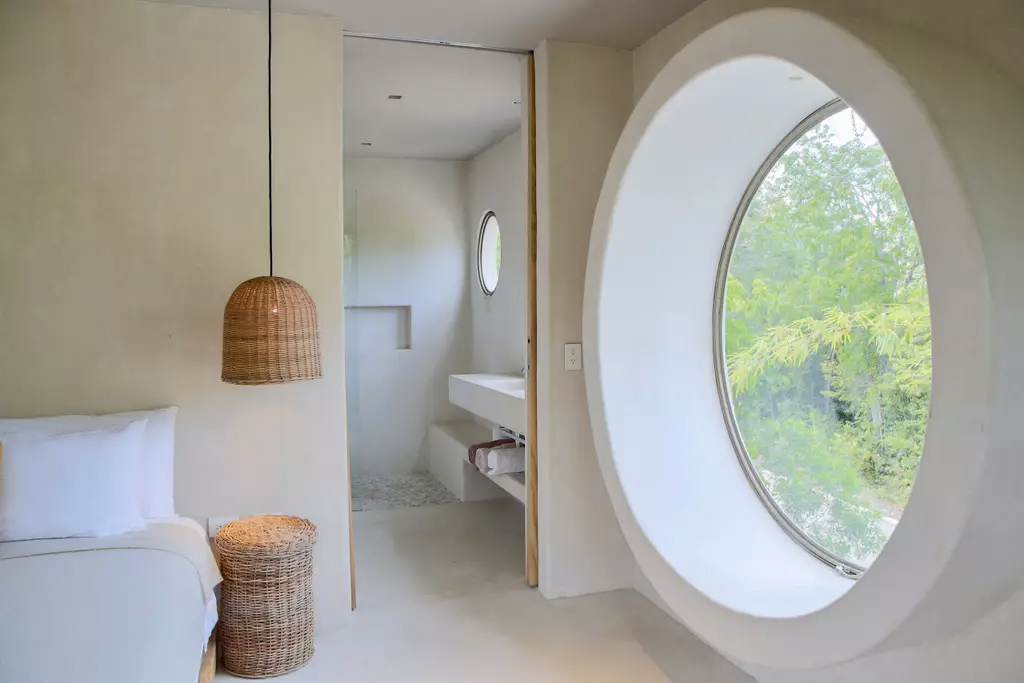 Every window in the house frames jungle views, adding a burst of colour to the villa’s sandy interiors. Villa Verde is available to rent via Airbnb from £628 per night, and also comes with a private rooftop terrace with views over the surrounding tree canopy.