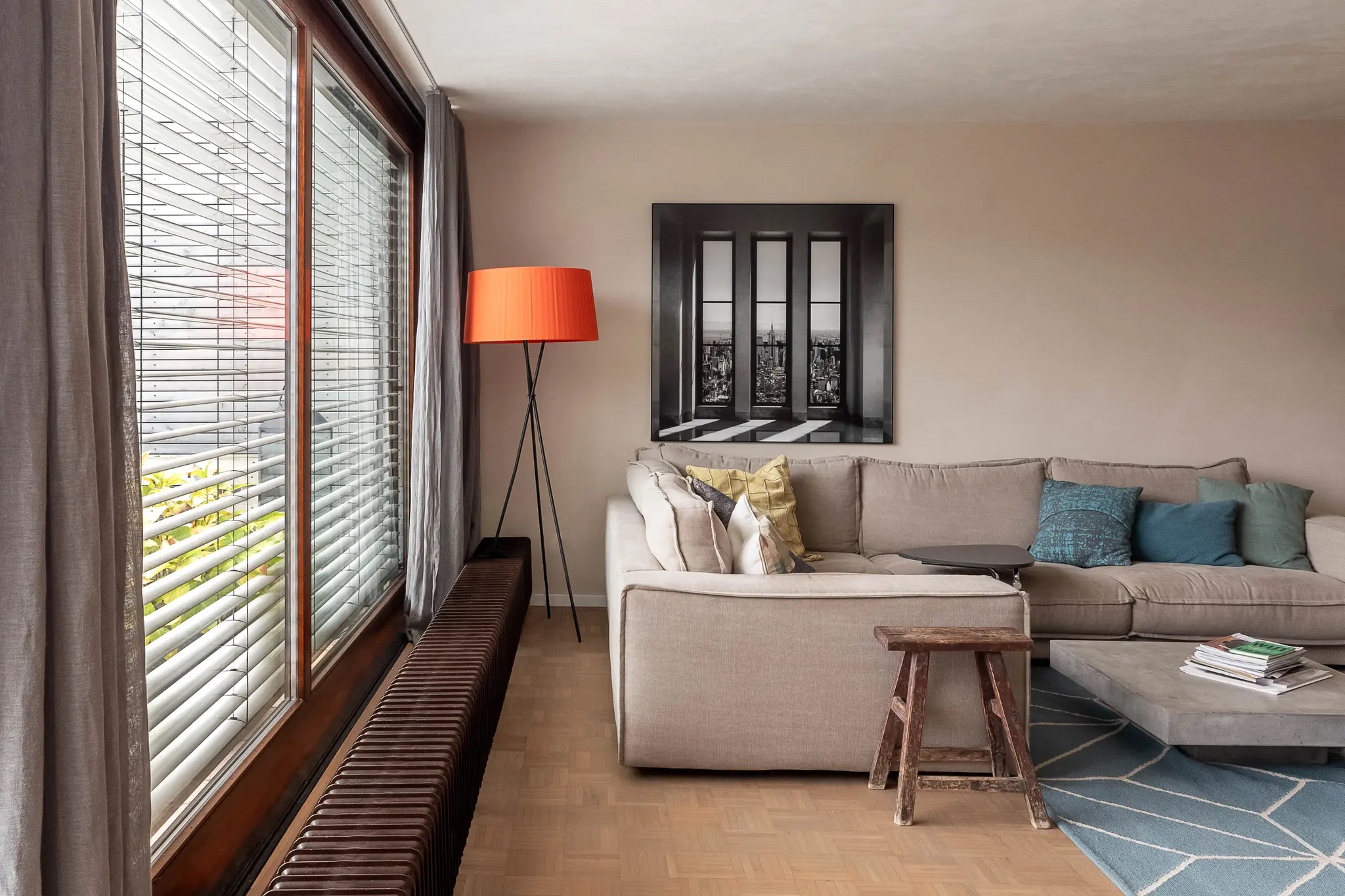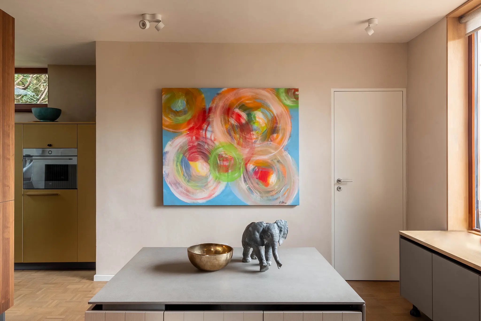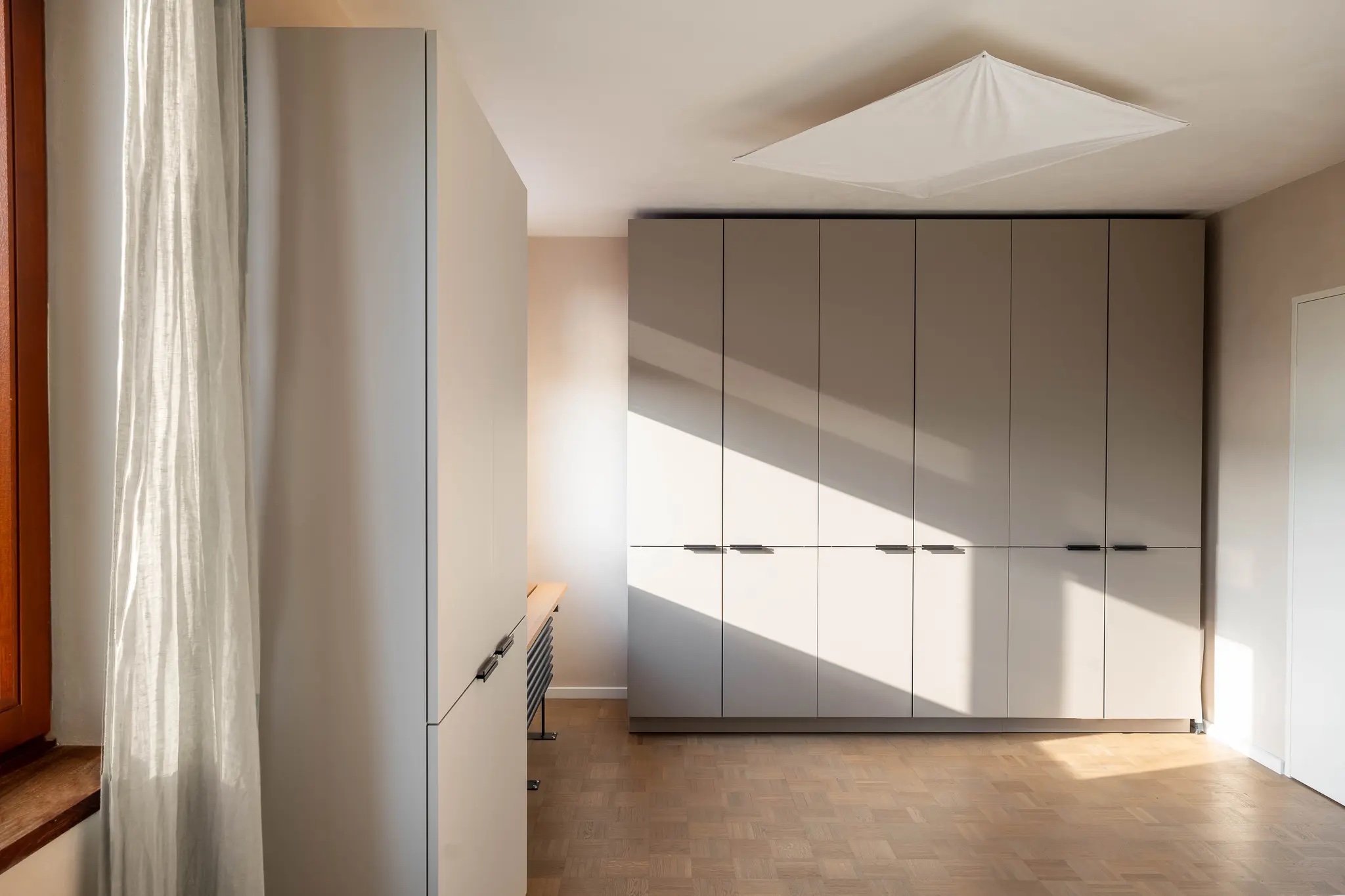 The flat-roofed home was designed around a courtyard-style entrance laid with natural flagstones. Renovations in 2020 spruced up the solid-wood door and window frames and the delicate wood siding. Inside the front door, the broad entrance hall has buffed parquet floors, clay-lime plaster walls and a reading niche with built-in oak storage, all flooded with natural light from vast roof lights. Wider-than-average windows have custom window seats and full-height wide-spec sliding doors lead out to the landscaped rear garden.