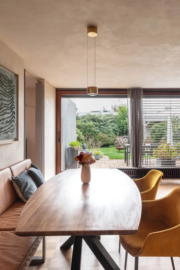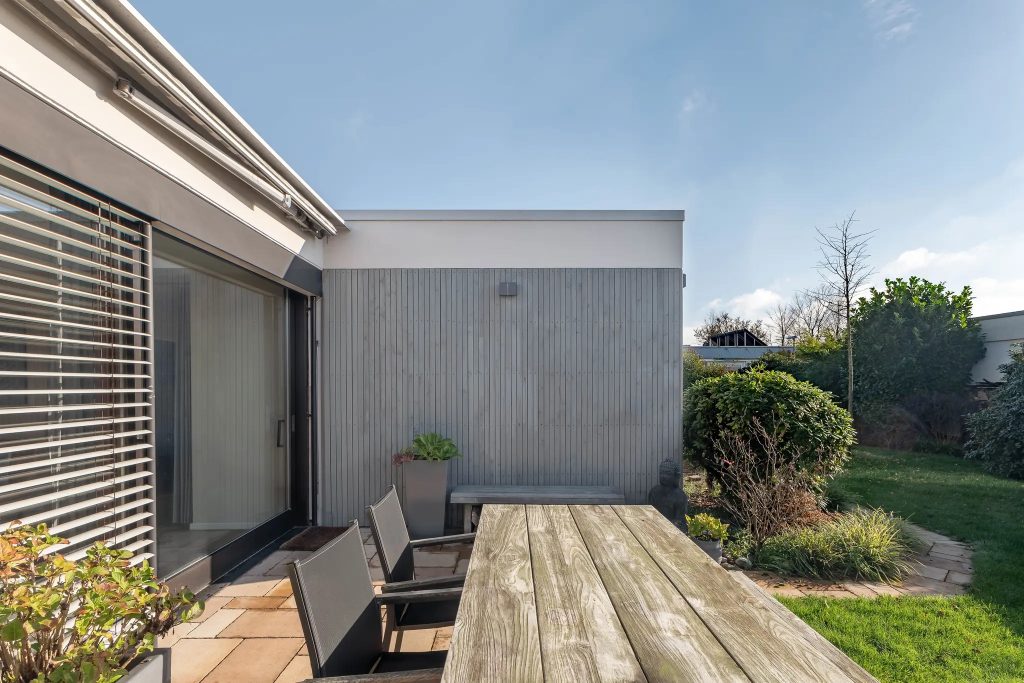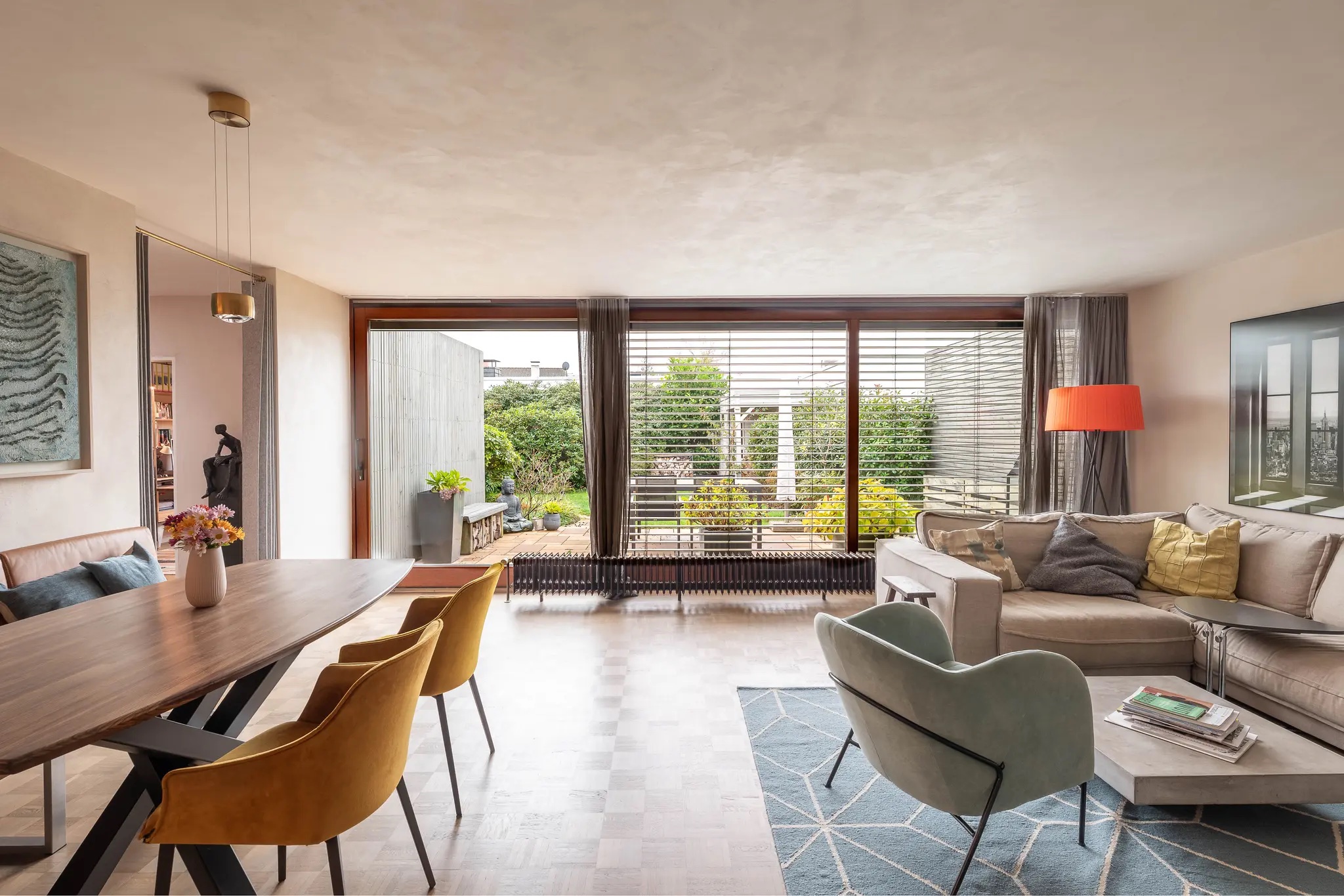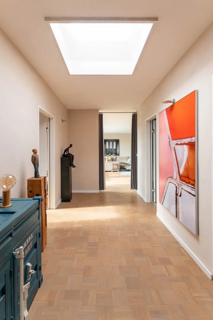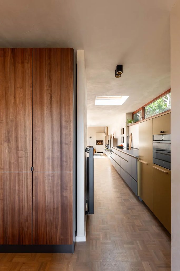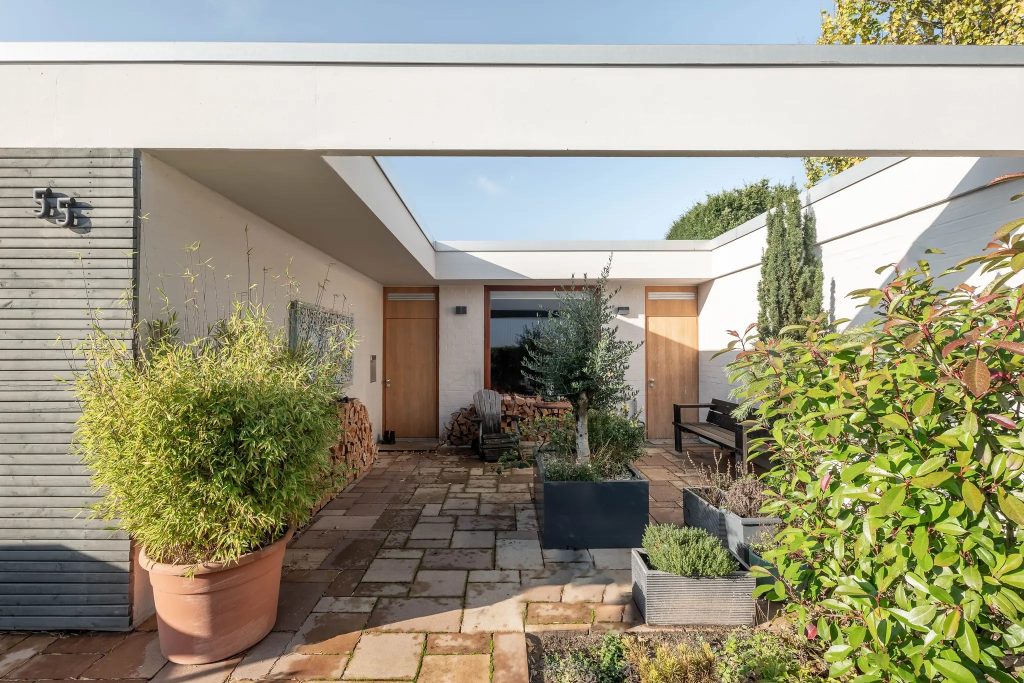 The flat-roofed home was designed around a courtyard-style entrance laid with natural flagstones. Renovations in 2020 spruced up the solid-wood door and window frames and the delicate wood siding. Inside the front door, the broad entrance hall has buffed parquet floors, clay-lime plaster walls and a reading niche with built-in oak storage, all flooded with natural light from vast roof lights. Wider-than-average windows have custom window seats and full-height wide-spec sliding doors lead out to the landscaped rear garden.