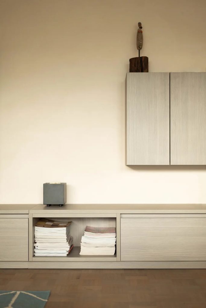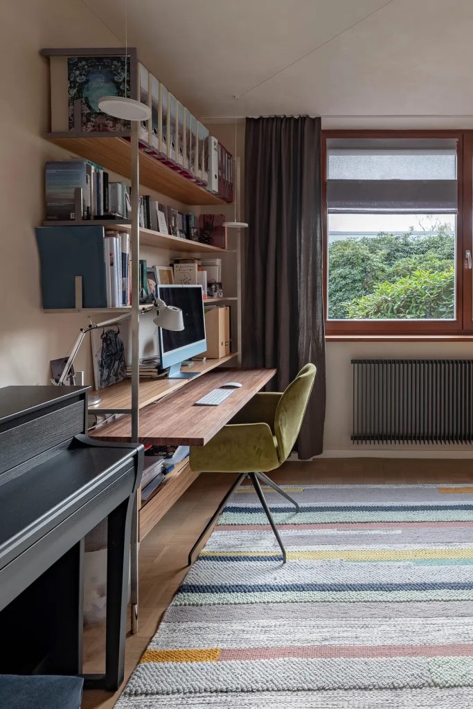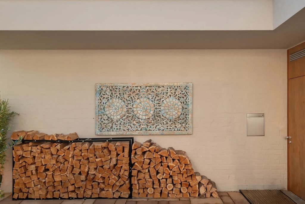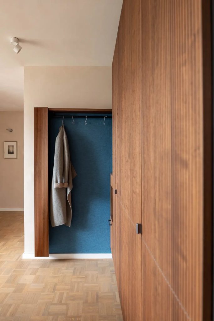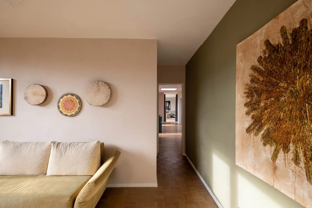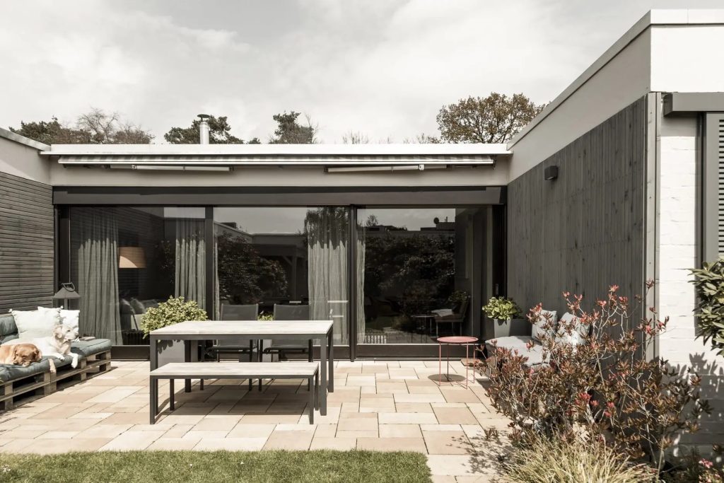 The flat-roofed home was designed around a courtyard-style entrance laid with natural flagstones. Renovations in 2020 spruced up the solid-wood door and window frames and the delicate wood siding. Inside the front door, the broad entrance hall has buffed parquet floors, clay-lime plaster walls and a reading niche with built-in oak storage, all flooded with natural light from vast roof lights. Wider-than-average windows have custom window seats and full-height wide-spec sliding doors lead out to the landscaped rear garden.