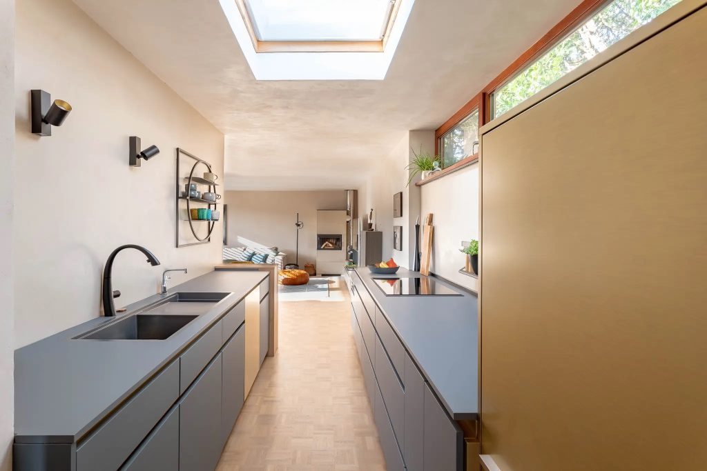 Dusty-blue and dove-grey accents with pops of goldenrod complement custom hardwood built-ins in the new open kitchen, lit from above and from a strip of clerestory windows. Beyond it, a spacious skylit hallway leads to three bedrooms, an en suite principal bedroom and an additional bathroom, and ends in a living area with an anthracite wood-burning stove.
