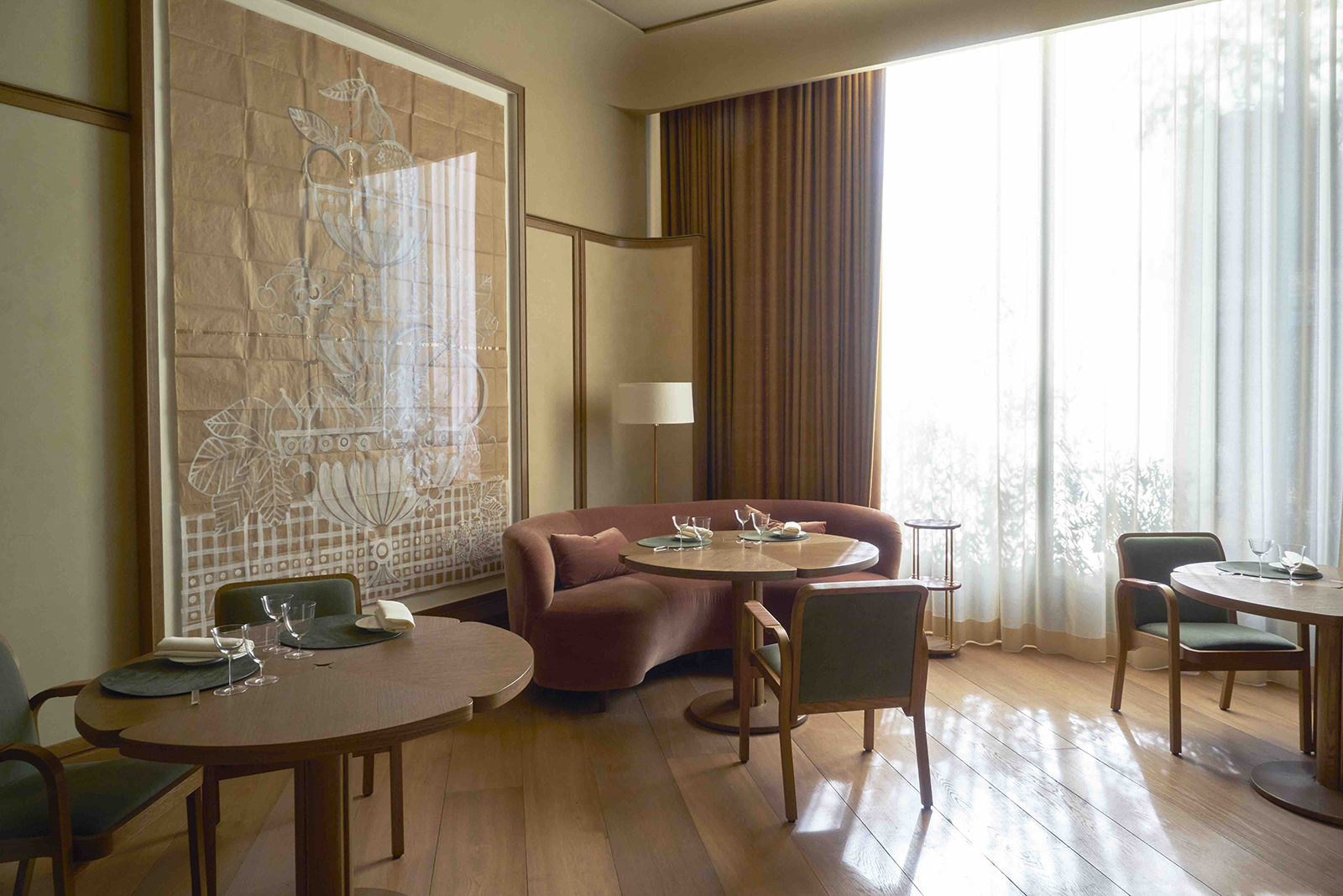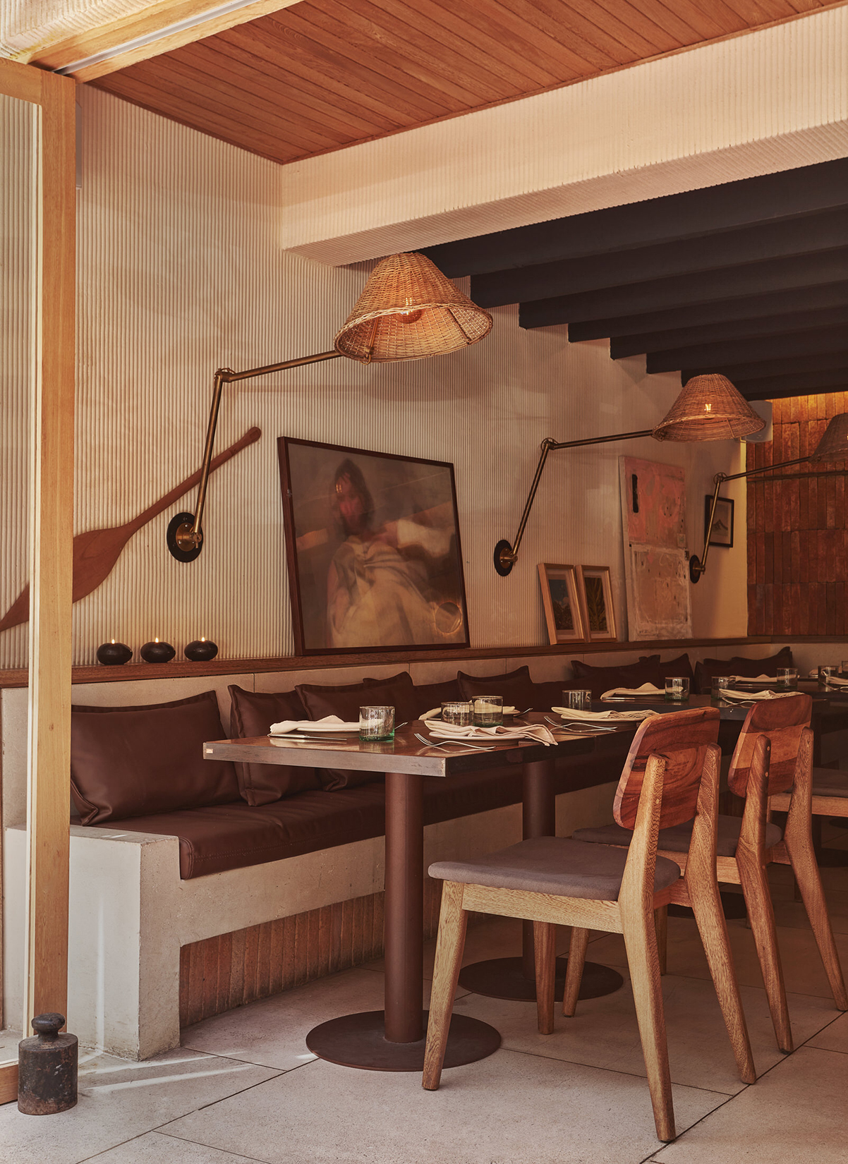 Housed in a mid-century building in Madrid’s Salamanca district, this restaurant, designed by Plantea Estudio, lets textural neutrals do the talking. The interior is all earthy tones, with coral-red marble as the star on countertops and backsplashes. Exposed concrete, brick and plasterwork add depth and dimension to the space.