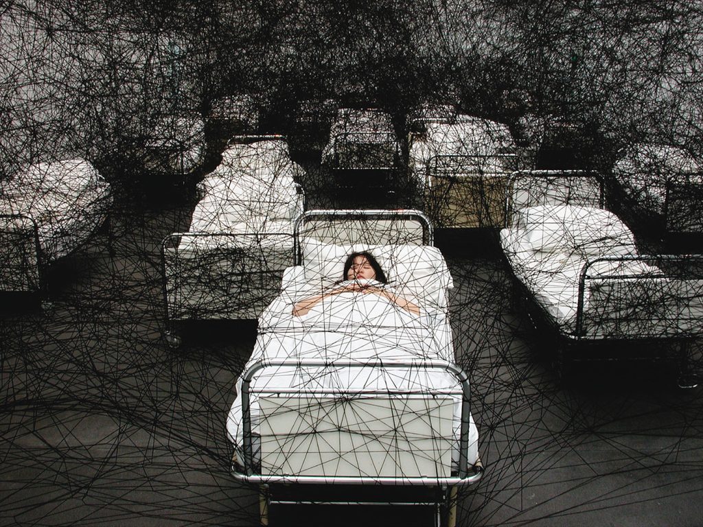 Chiharu Shiota, Breathing from Earth, 2000 Performance Installation, Kunstraum Maximilianstrasse, Stadtforum München, Munich, Germany Photo by Sabine Klem © DACS, London, 2025 and Chiharu Shiota.