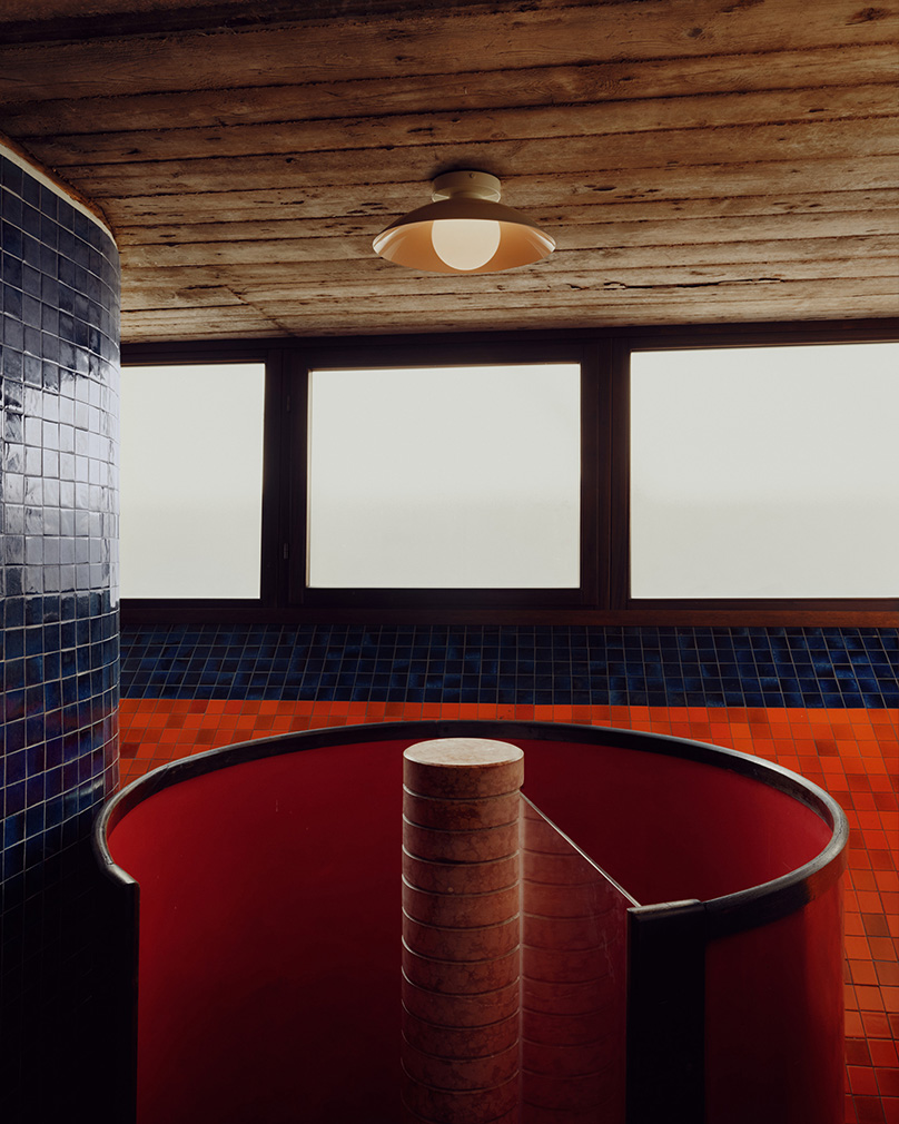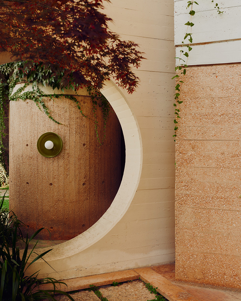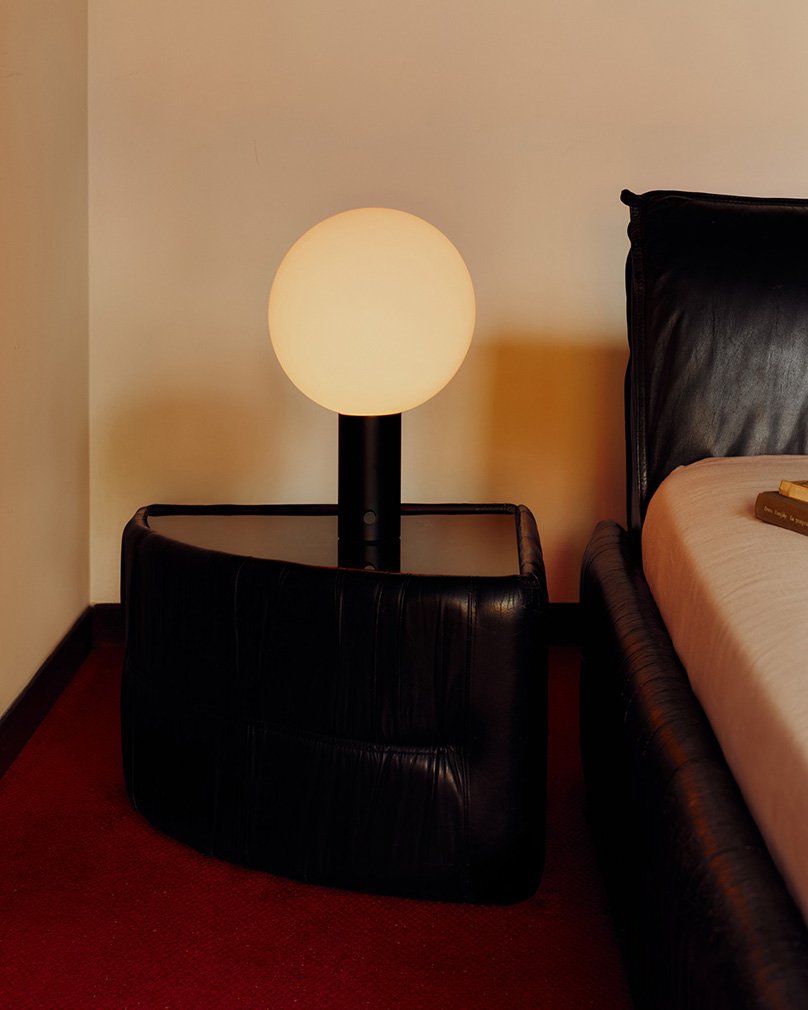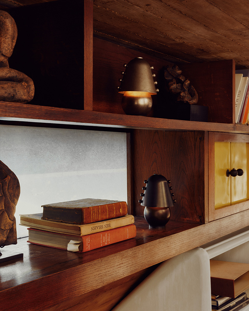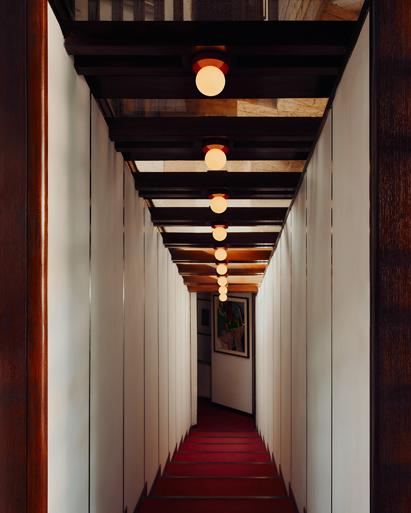 Allowing the villa’s unusual twists and turns to direct the narrative, they dove into their archives for pieces to light the hallways, stairwells and expressively angled rooms, echoing the elements of restraint in what they call ‘a love letter to the architecture and interiors that have shaped our practice’. Objects enter into conversation with the home’s existing geometries and forms, as in the slow-slung lounge, where the designers inserted their Arundel lamps — a top-down pendant in bone-white and a standing lamp in oxide-red. Two surface-mount designs light the spiral stairwell, one in the concave Arundel style, another stacked from the Puck collection. And Orb lights pop up in various forms, by a bedside and down a staggered stair with complementary red carpet.