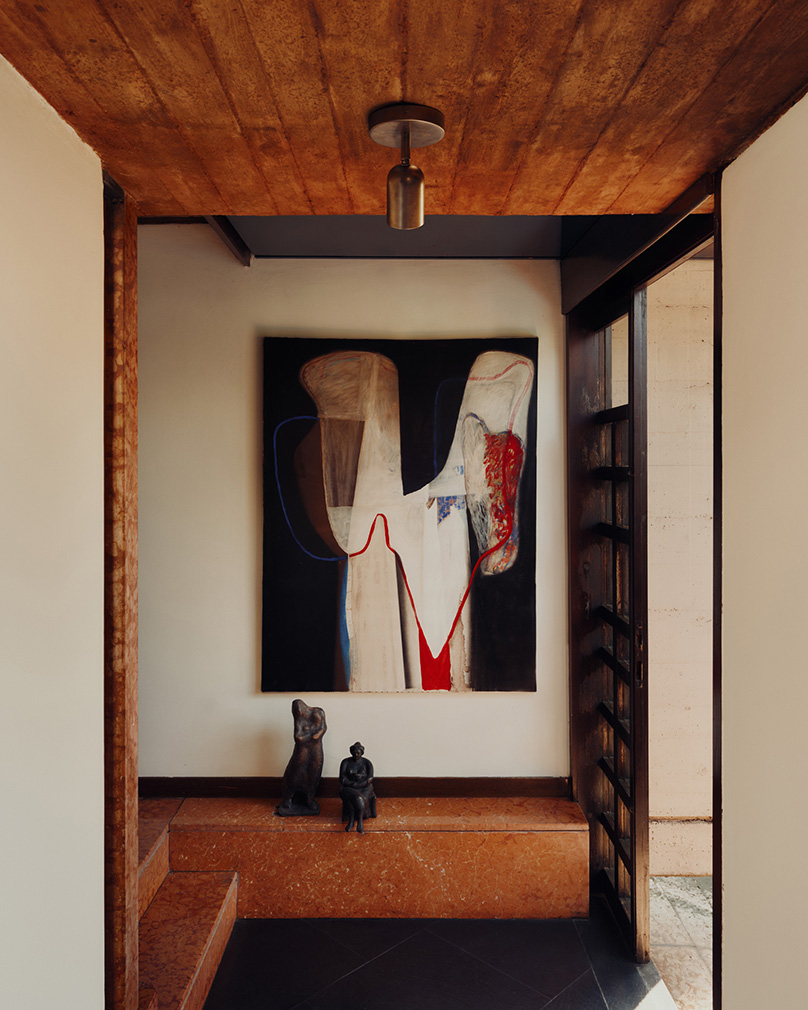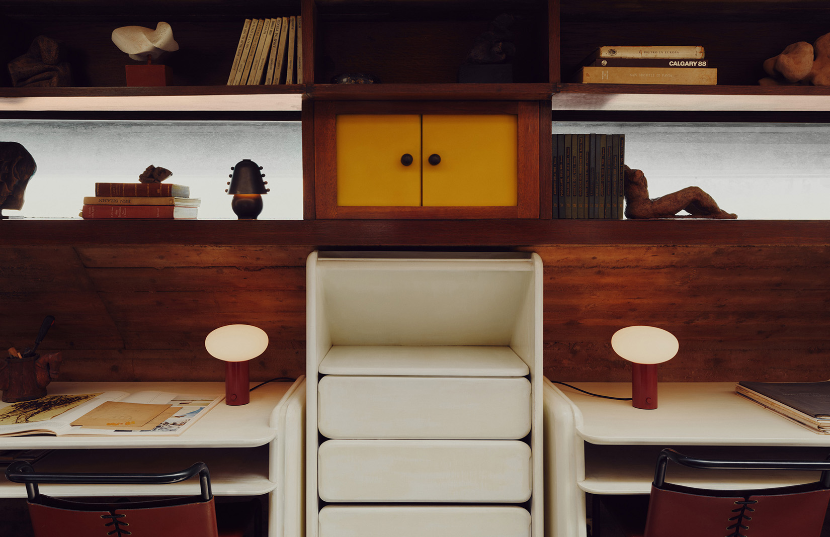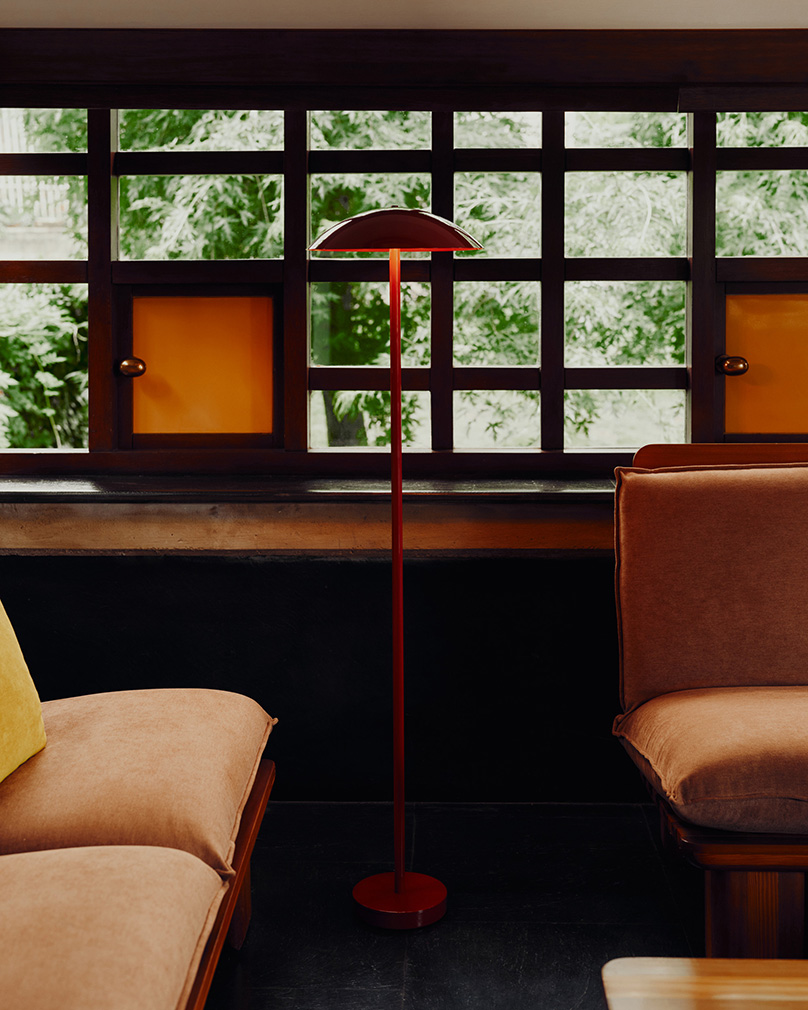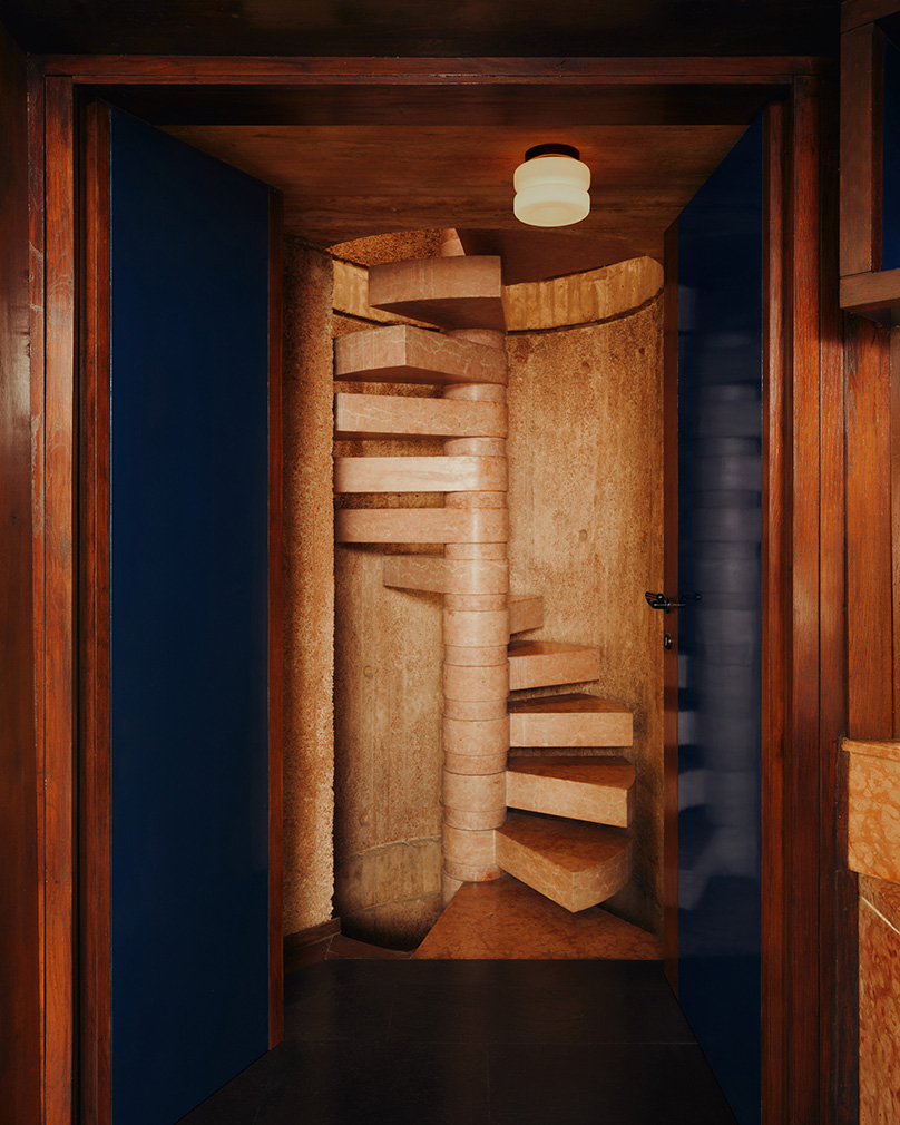 Allowing the villa’s unusual twists and turns to direct the narrative, they dove into their archives for pieces to light the hallways, stairwells and expressively angled rooms, echoing the elements of restraint in what they call ‘a love letter to the architecture and interiors that have shaped our practice’. Objects enter into conversation with the home’s existing geometries and forms, as in the slow-slung lounge, where the designers inserted their Arundel lamps — a top-down pendant in bone-white and a standing lamp in oxide-red. Two surface-mount designs light the spiral stairwell, one in the concave Arundel style, another stacked from the Puck collection. And Orb lights pop up in various forms, by a bedside and down a staggered stair with complementary red carpet.