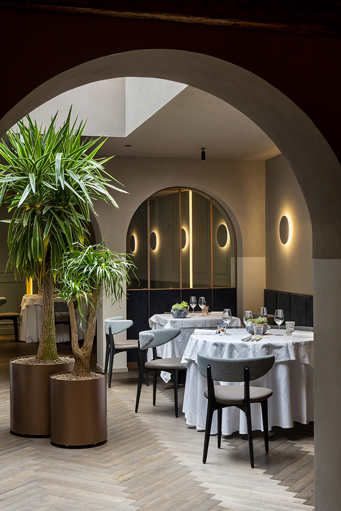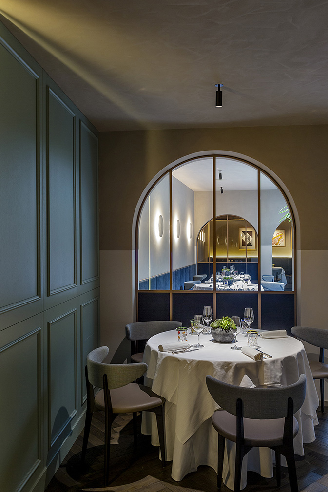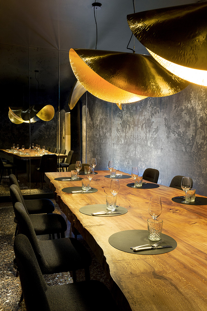 A moody colour palette of dark blue hues and natural tones gives the restaurant’s interiors a sophisticated air, extenuated by gold, disc-like lighting fixtures which highlight the building’s features. Furnishings comes from the likes of Moroso, LaCividina, Gervasoni, Tonon, and Tabula.