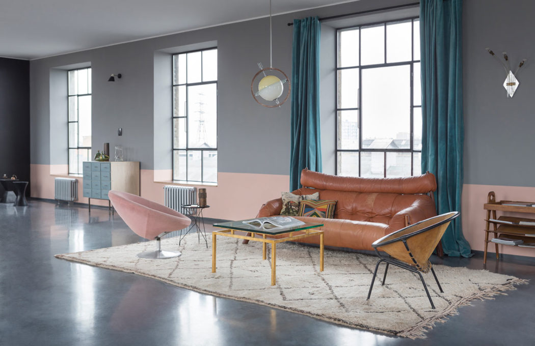 Furniture and pieces collected by A+Z from flea markets and antique shops fill the four-storey building, which is a protected industrial monument. The duo also created furniture for the space, including a black lounge chair covered in strips of fabric taken from their Gypsy collection.