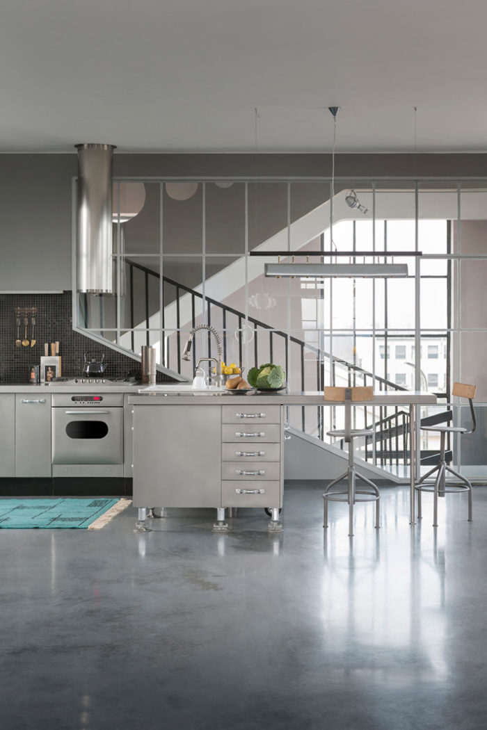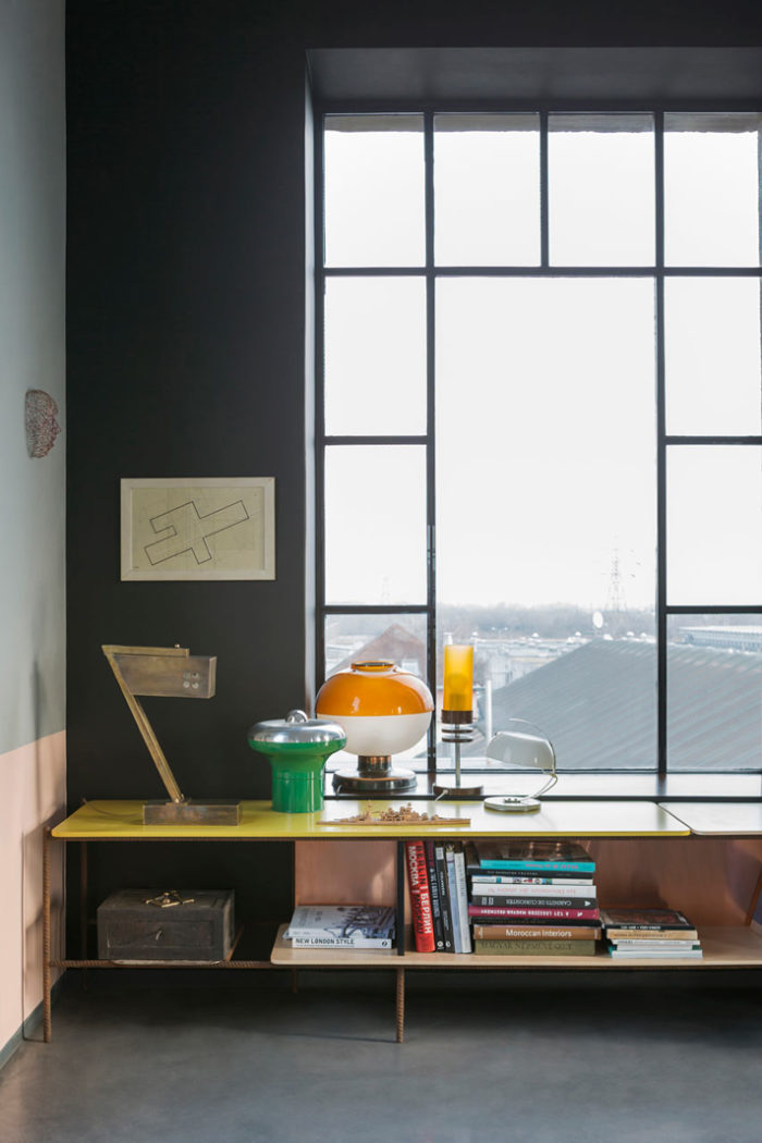 Original structural features and the building’s iron doors were retained, while beams have been repurposed as shelving. The fourth floor of the factory houses a sauna, gym and library, as well as a swimming pool converted from a concrete water tank.