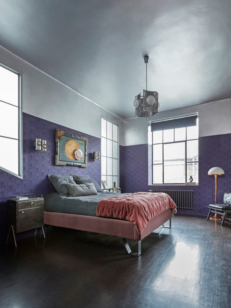In contrast with the open spaces of much of the building, the bedroom was created with a ‘boudoir-like’ feel, using bolder colours and patterned wallpaper.