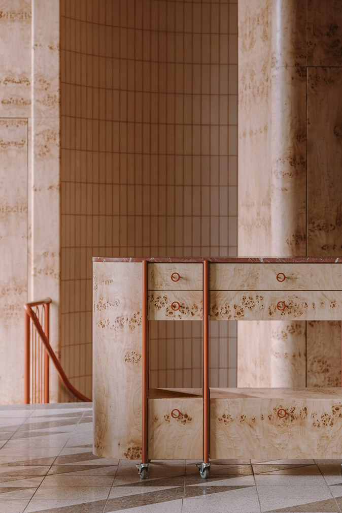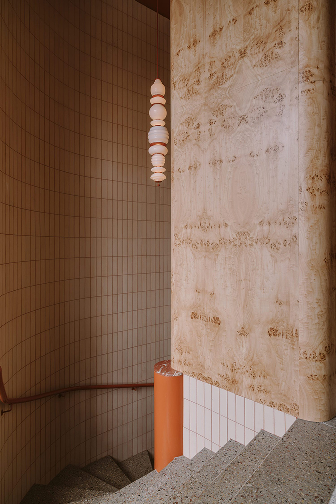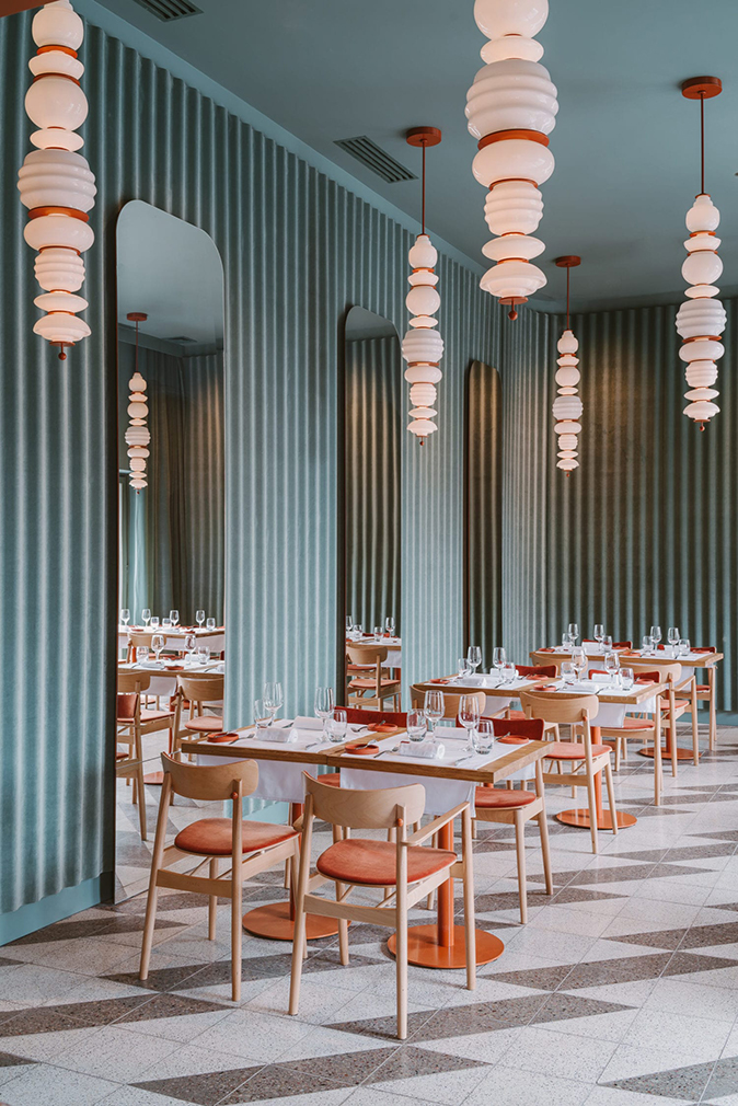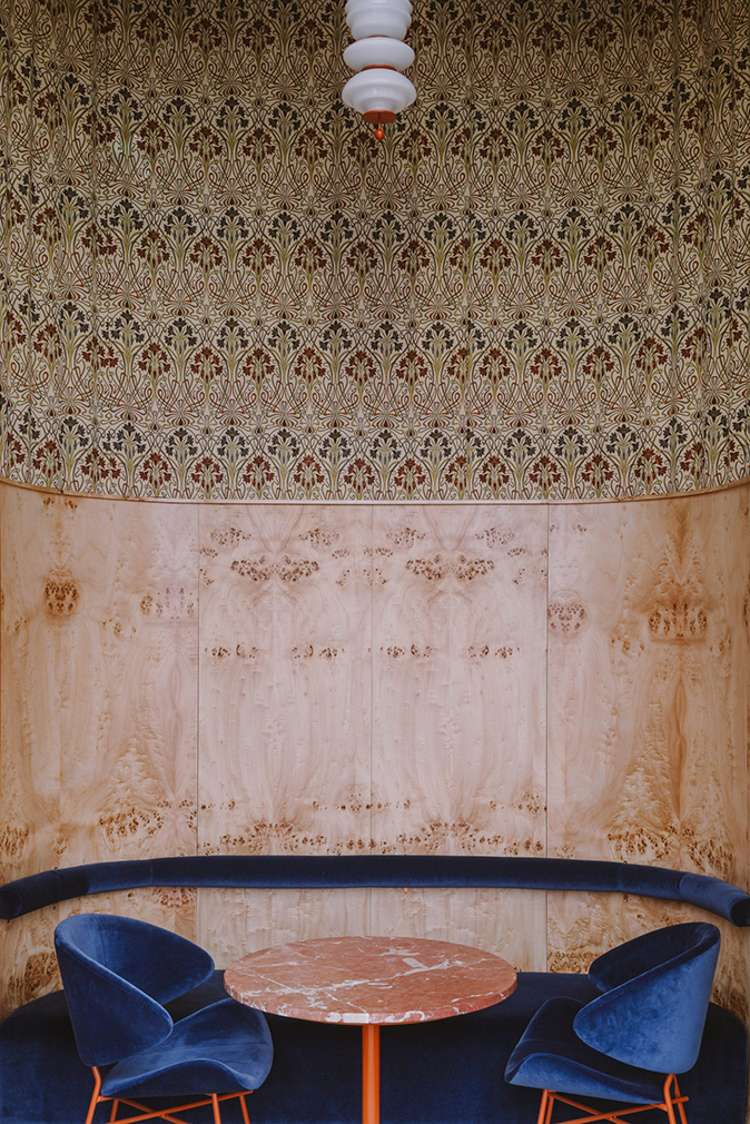 The corrugated walls of the modern Polish eatery are covered in green, blue and peach-coloured velvet. Buck has used contrasting textures throughout the interiors, pairing white subway tiles with wood panelling in the stairway, and red marble tabletops with floral wallpaper in the private dining room.
